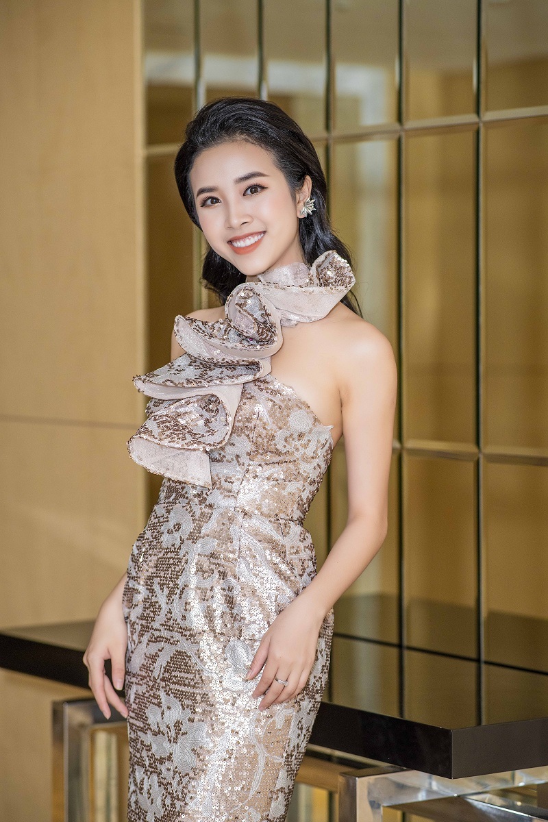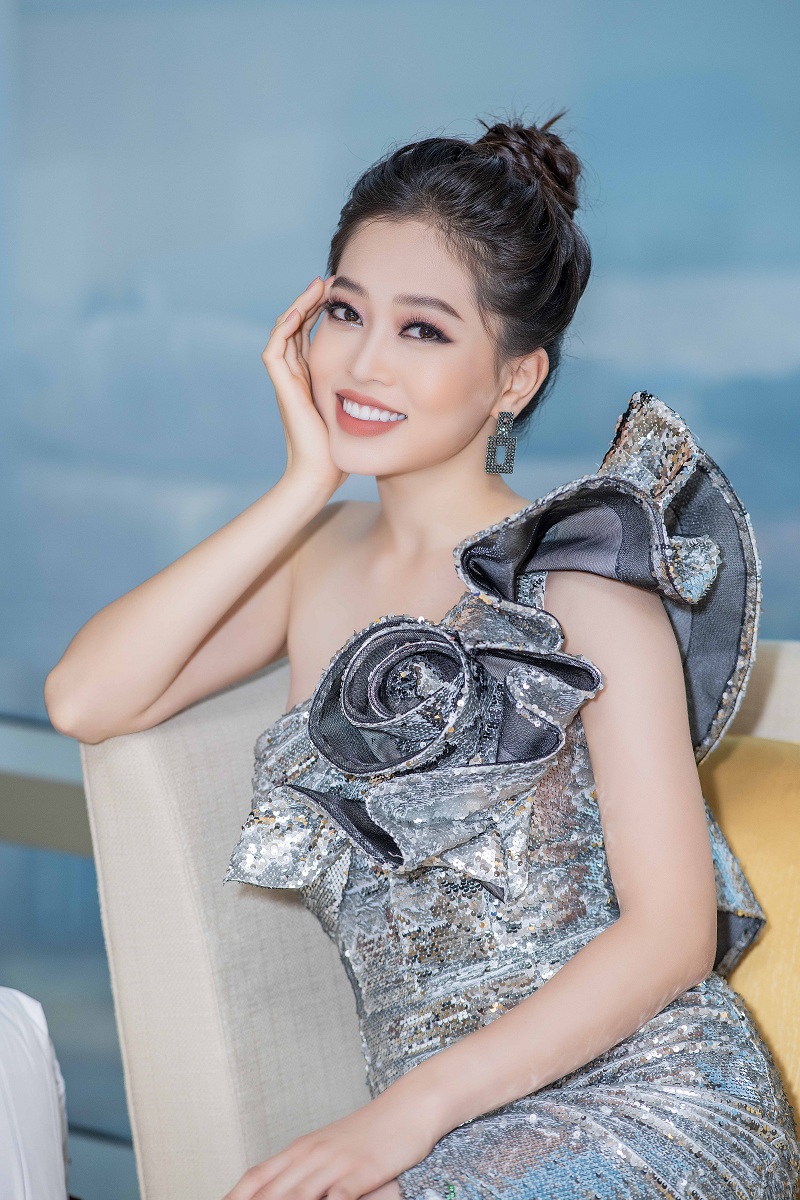 Hoa hậu Tiểu Vy xinh đẹp với mái tóc xoăn uốn lọn cùng với thiết kế váy sequin lấp lánh màu xanh dương