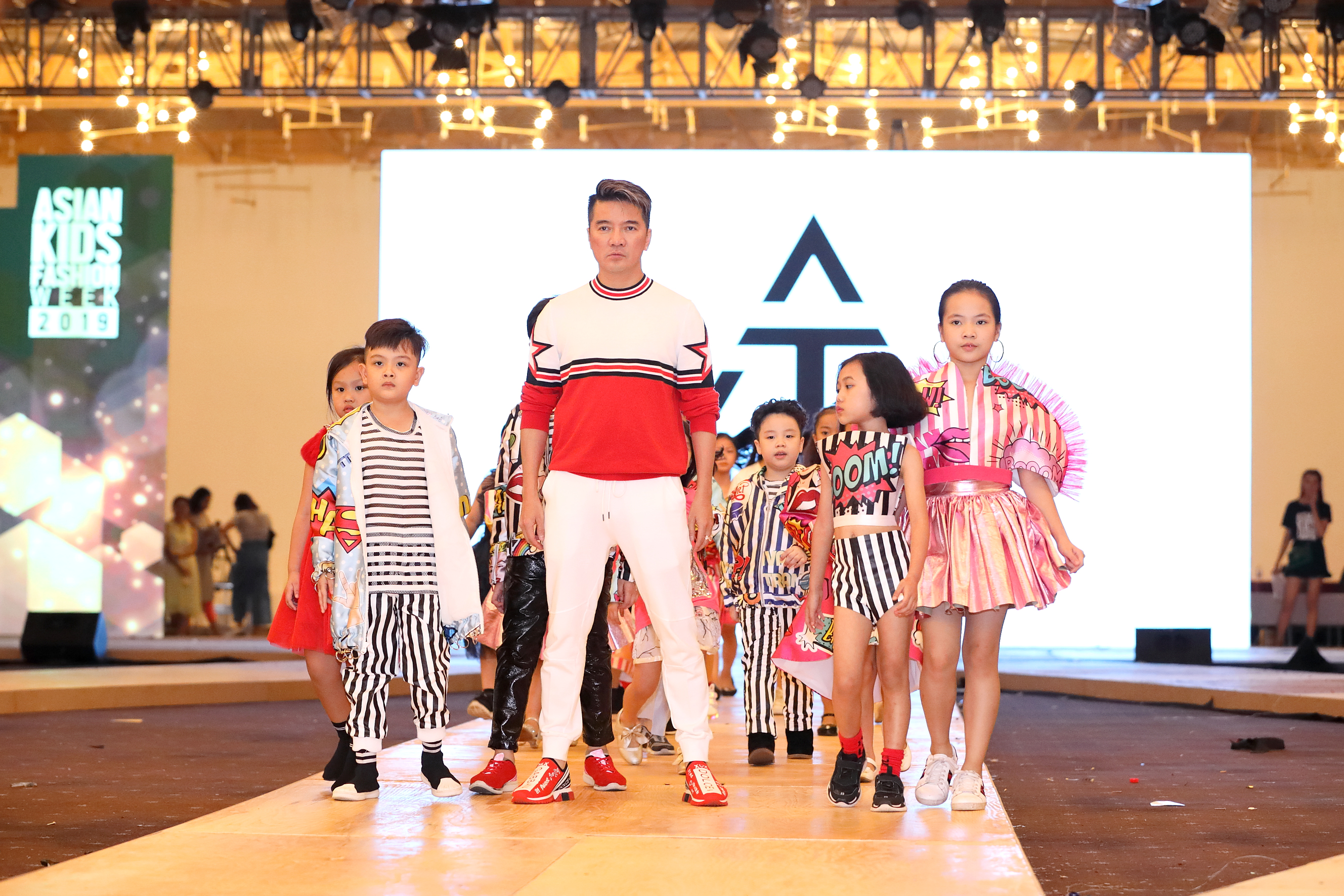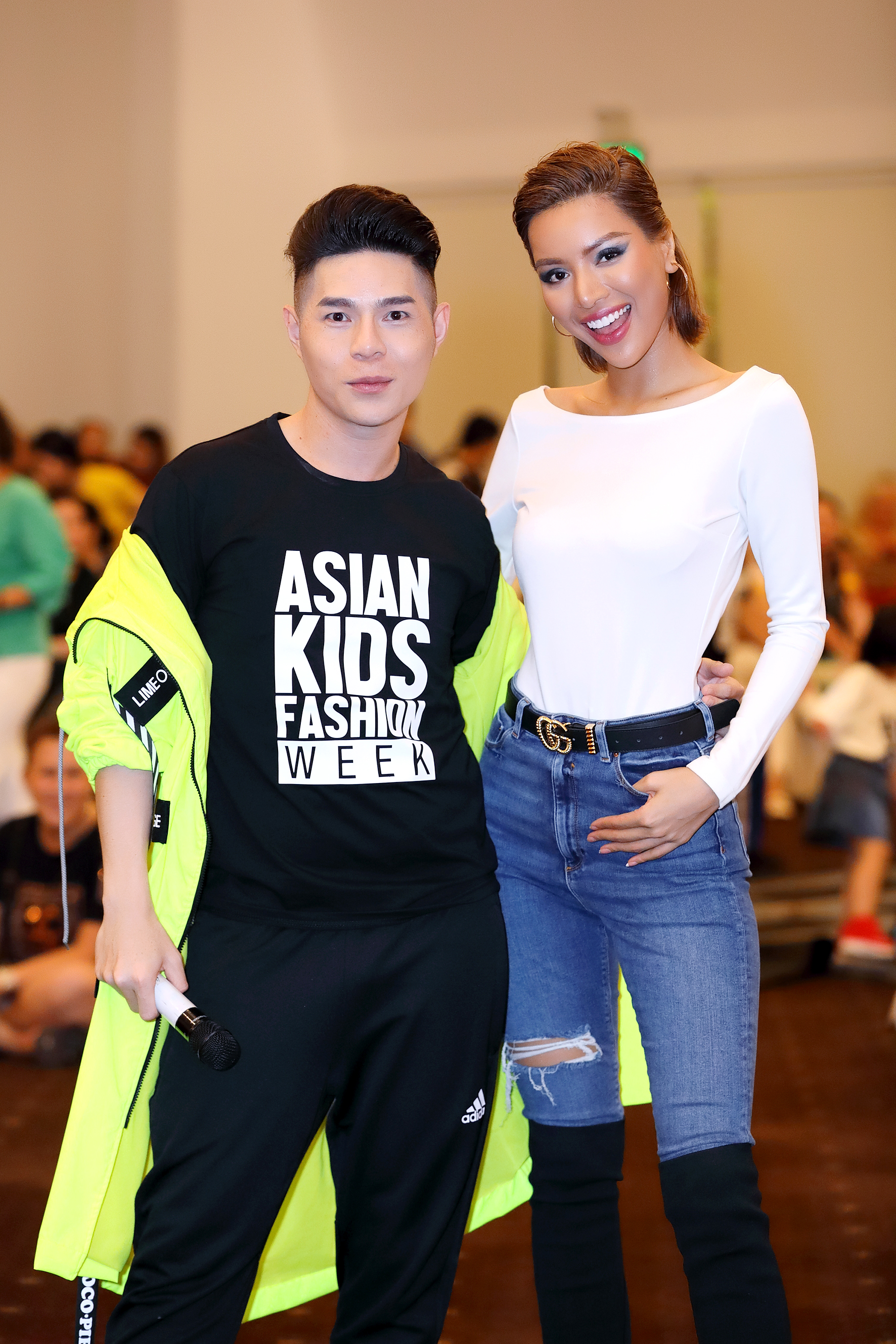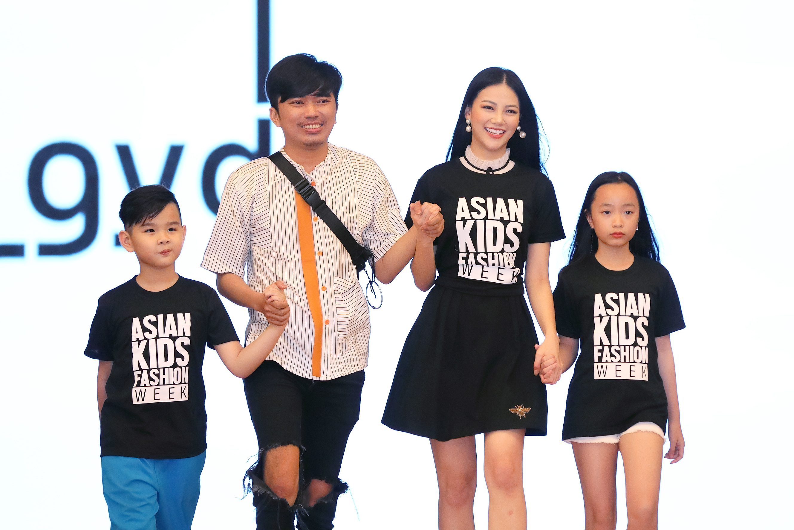 Phương Khánh nô đùa cùng dàn mẫu nhí nắm tay tập dợt đi catwalk cho các bé thiếu nhi.