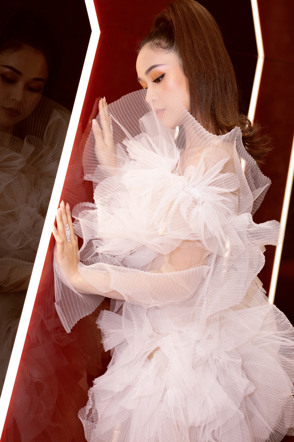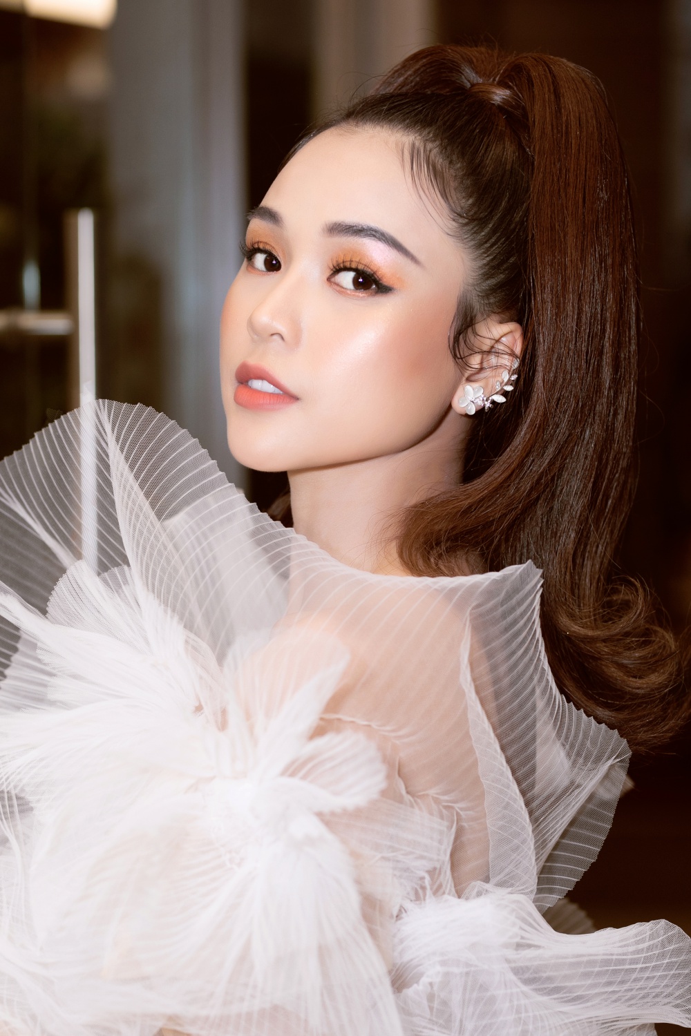 Người đẹp khéo léo chọn đôi cao gót trắng cùng tông, hoa tai ánh bạc lấp lánh nhằm tạo nên tổng thể phù hợp.