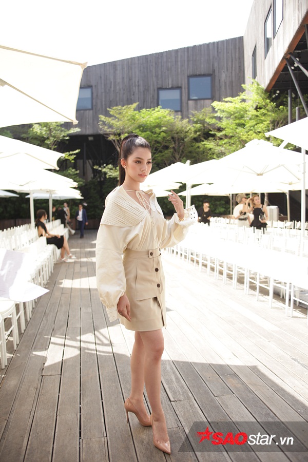 Jolie Nguyễn diện thiết kế mới nhất của Lâm Gia Khang với vẻ ngoài năng động nhưng cũng không kém phần sang chảnh khi để kiểu tóc buộc cao đuôi ngựa.
