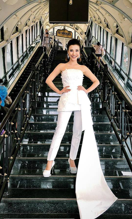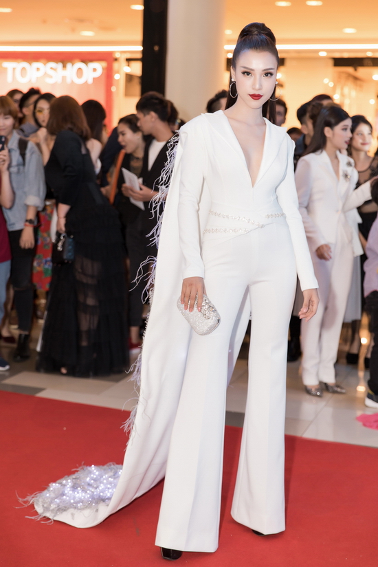 Đôi chân dài cũng vì thế được phô trọn vẹn, nàng Á hậu khoe làn da trắng sáng quyến rũ. Chi tiết khoét sâu ở cổ áo tạo sự cá tính hơn nhưng cũng không kém phần gợi cảm. Không có chiều cao nổi trội, “Dung đại ca” khéo tay chọn cho mình kiểu tóc cột đuôi ngựa, vóc dáng vì thế trông cao ráo hơn rất nhiều.