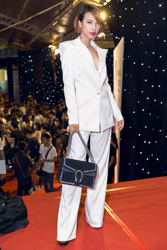 Xuất hiện tại một sự kiện âm nhạc trên cương vị MC dẫn dắt chương trình, nữ diễn viên “Tháng năm rực rỡ” nổi bật trong một thiết kế có sự cách tân lạ mắt. Thiết kế “2 trong 1” này quả thật lợi hại bởi đó là sự sáng tạo kết hợp giữa vest và Jumpsuit. Đặc biệt kiểu quần “ống mất ống còn” giúp “Dung đại ca” càng trở nên cá tính trong set đồ này.