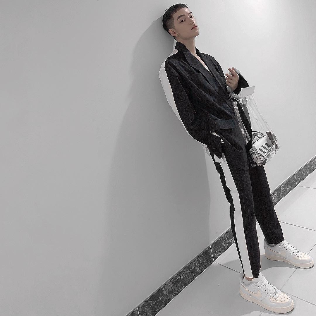 Không cần cầu kỳ, chỉ dùng tông màu đen trắng cùng cách phối phụ kiện đúng xu hướng, Kelbin vẫn hoàn toàn nổi bật.