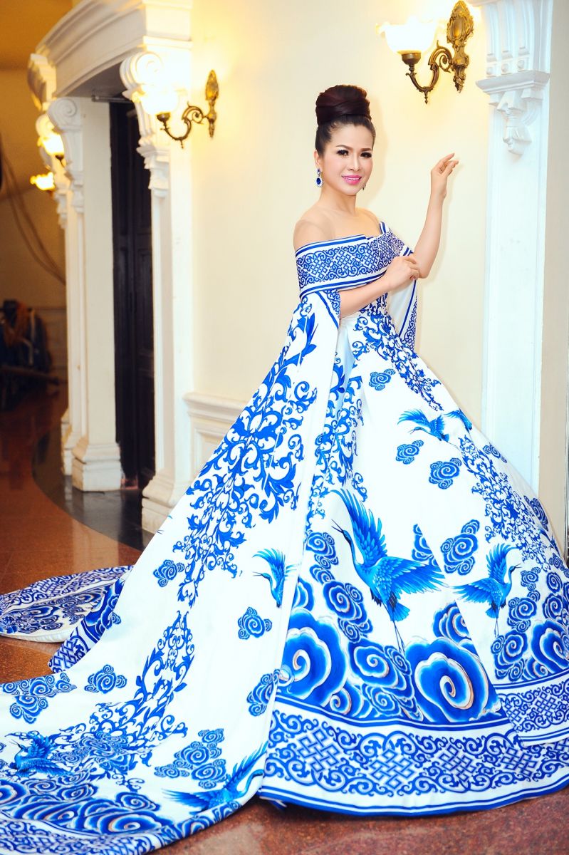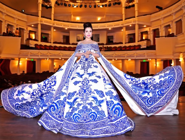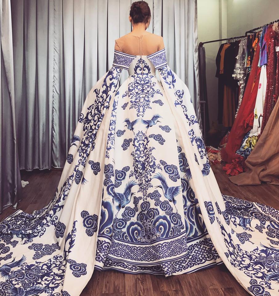Thiết kế có dáng gần giống với trang phục truyền thống của Hàn Quốc, tông màu trắng chủ đạo, thiết kế cầu kỳ với họa tiết chim hạc và hoa văn gốm sứ màu xanh dương, xòe rộng ở phần đuôi vô cùng nổi bật.