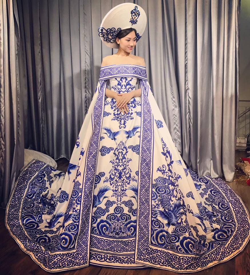 Theo thông tin đăng tải trên tài khoản cá nhân của Á khôi Hoa khôi Du lịch Việt Nam 2017, bộ đầm này sẽ là Quốc phục cô sẽ mang tới Miss Globe Beauty Queen năm nay. Được biết, đây là trang phục của NTK Brian Võ.