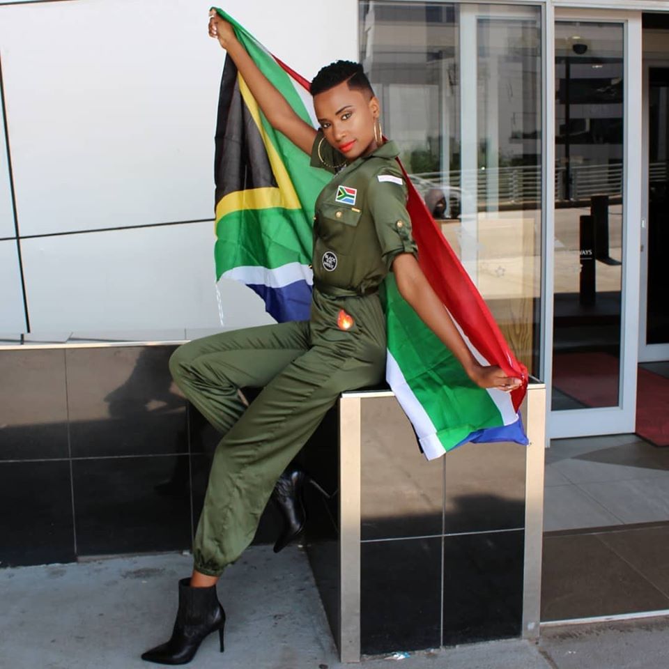 Hoa hậu Nam Phi chọn phong cách quân đội với bộ jumpsiut xanh rêu.