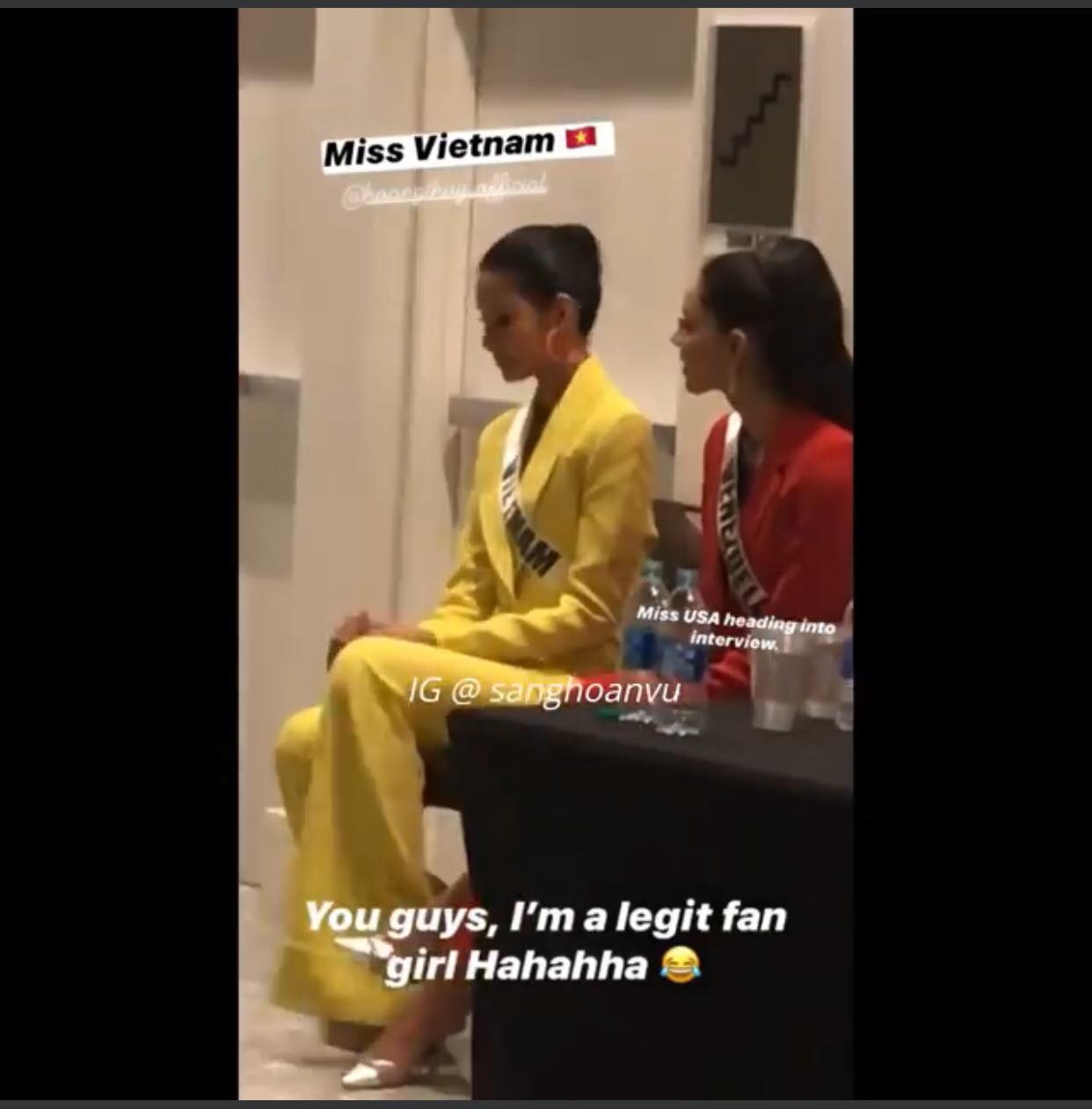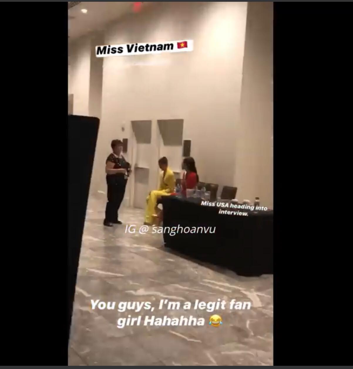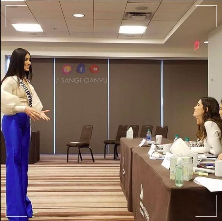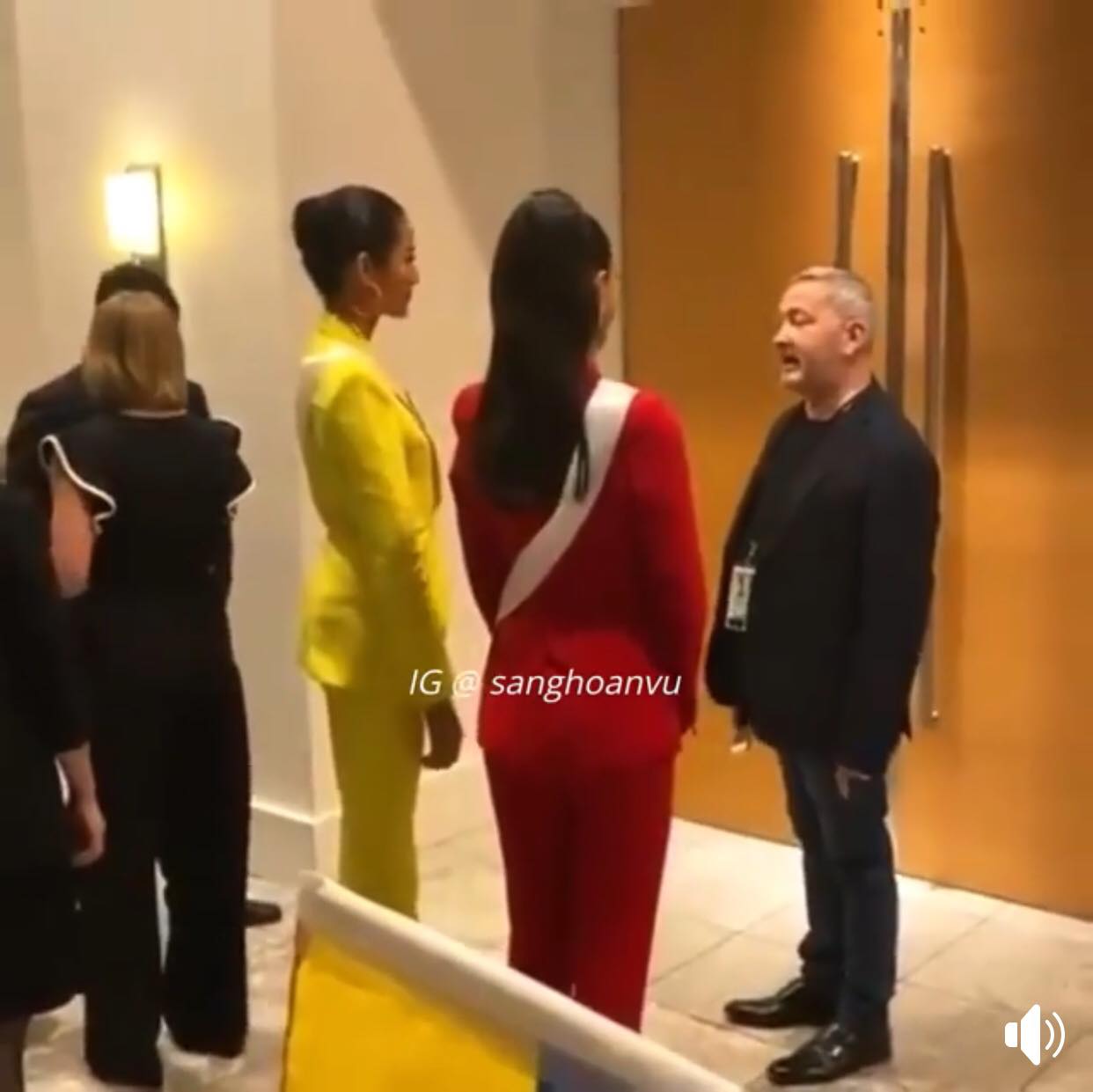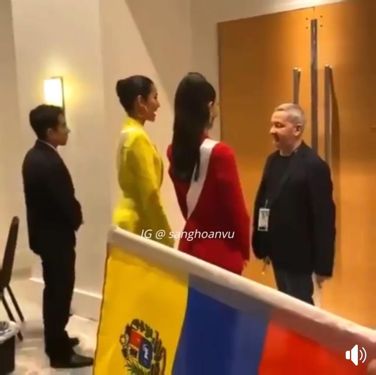 Hoàng Thùy và đại diện Venezuela nghe hướng dẫn của ban tổ chức trước khi bước vào cánh cửa hội ngộ ban giám khảo.