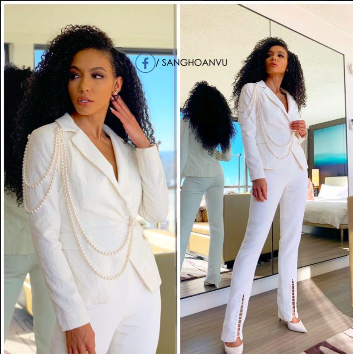 Hoa hậu Mỹ chọn suit trắng thanh lịch.