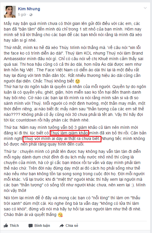 Status của Kim Nhung được cho là bức xúc với lời của HLV Hoàng Thùy dành cho HLV Lan Khuê. Ngoài ra, cô cho rằng việc nhận xét về HLV của 1 cuộc thi mà cô đã là thí sinh là quyền tự do ngôn luận của mình. Cô cũng chia sẻ: “Ai dạy ai thật ra chưa biết.”