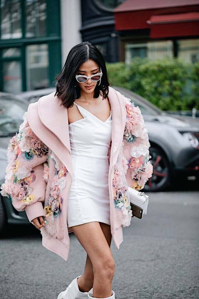 Bên trong chiếc áo khoác là một chiếc đầm trắng ngắn ôm sát, kết hợp với các phụ kiện như kính mát mắt mèo và đôi boots trắng cổ cao