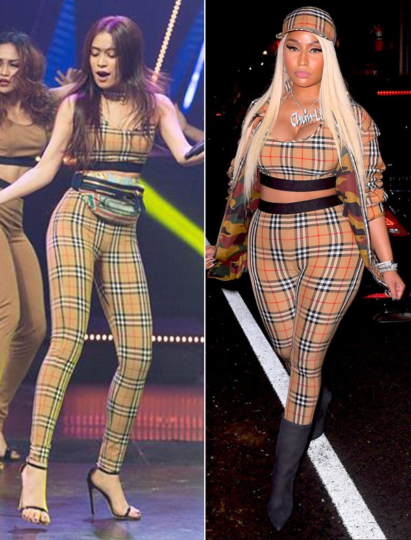 Hoàng Thùy Linh mới đây vừa diện cả cây Burberry trên sân khấu của một chương trình truyền hình. Nào ngờ, bộ cánh này từng song hành cùng Nicki Minaj trên đường phố cách đây chỉ mới vài tuần.