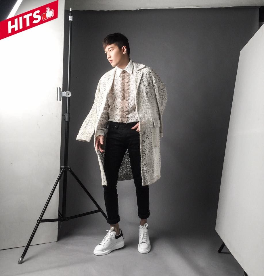 Chàng ca sĩ Huỳnh Trường Thịnh ghi điểm bằng phong cách bụi phủi với chiếc denim jacket đính sitcker lạ mắt phối cùng trang phục all-black.
