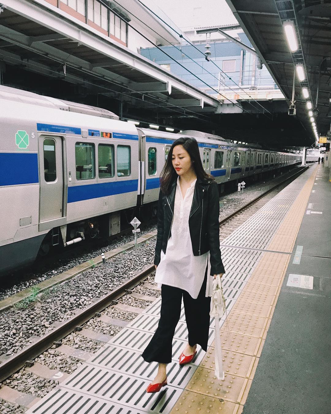 Áo sơ-mi vạt dài xẻ tà hai bên mix cùng quần ống loe và áo khoác da là cách Văn Mai Hương trở nên chất, ngầu hết mức trên đường phố Nhật Bản.