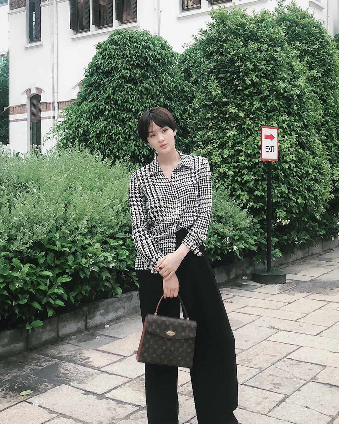 Hiền Hồ thời thượng với set đồ trung tính cùng cách cắm thùng áo sơ-mi vạt trong, ngoài. Mái tóc ngắn cũng là một điểm cộng giúp nữ ca sĩ tạo nên vẻ ngoài trendy, hợp xu hướng.