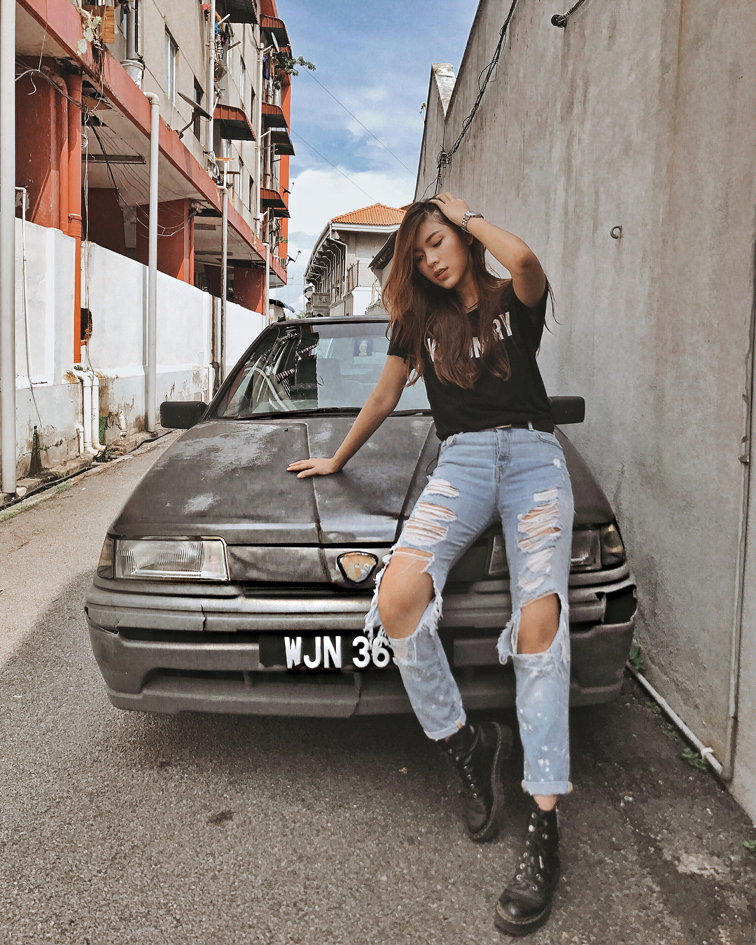 Đồng Ánh Quỳnh tiếp tục theo đuổi phong cách cá tính cùng combo áo phông basic và quần jeans rách. Chiếc quần được xé rách, “trống trải” hết cỡ tạo thành điểm nhấn bắt mắt, tăng độ chất chơi cho người đẹp The Face.