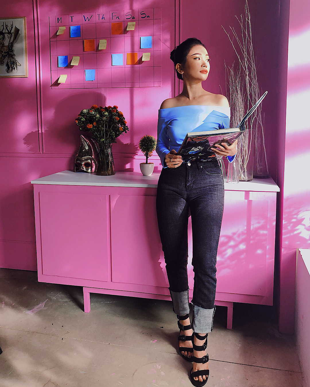 Những kiểu áo, váy trễ vai luôn là item được các nàng yêu thích mỗi khi mùa hè đến gần. “Gái ế” Sĩ Thanh cũng nhanh chóng tậu cho mình một chiếc áo off-shoulder mix cùng quần jeans xắn gấu ôm sát khoe triệt để đường cong.