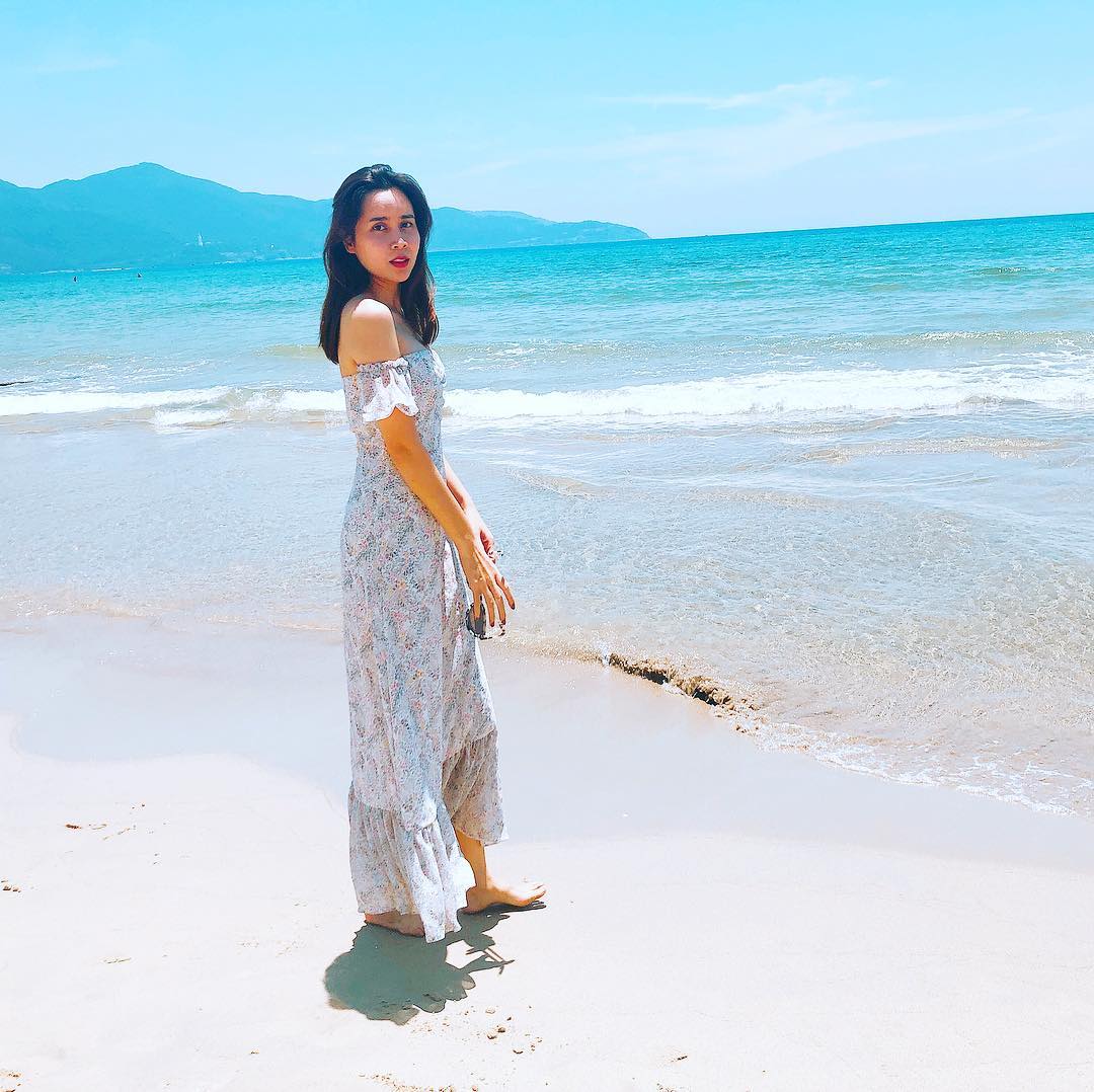 Lưu Thiên Hương “chống chọi” với cái nắng mùa hè khi thả dáng trên bãi biển cùng đầm maxi bay bổng.