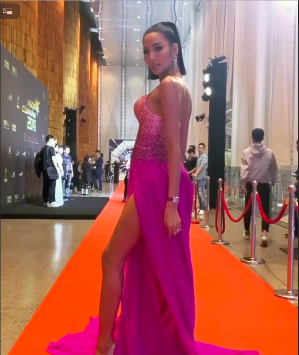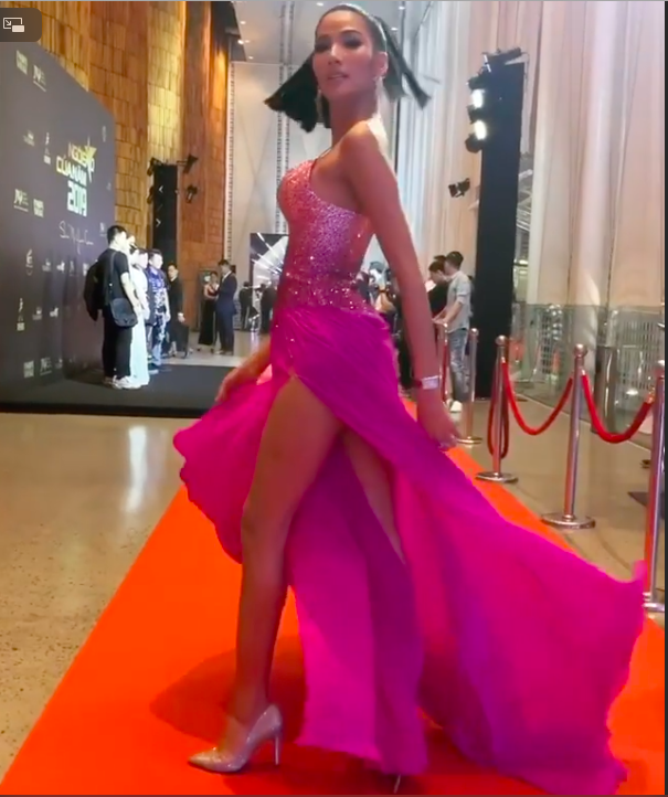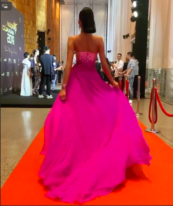 Xuất hiện trên thảm đỏ, Hoàng Thùy gây bất ngờ khi diện lại bộ váy hồng cánh sen từng là một trong những thiết kế được đại diện Việt Nam mang đi để chinh chiến Miss Universe. Tuy nhiên bộ cánh đã không xuất hiện trên sân khấu, và lần diện này như một cách để Hoàng Thùy nhắc khéo thành tích top 20 Miss Universe của mình.