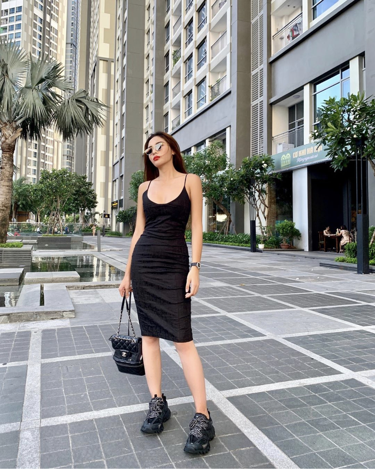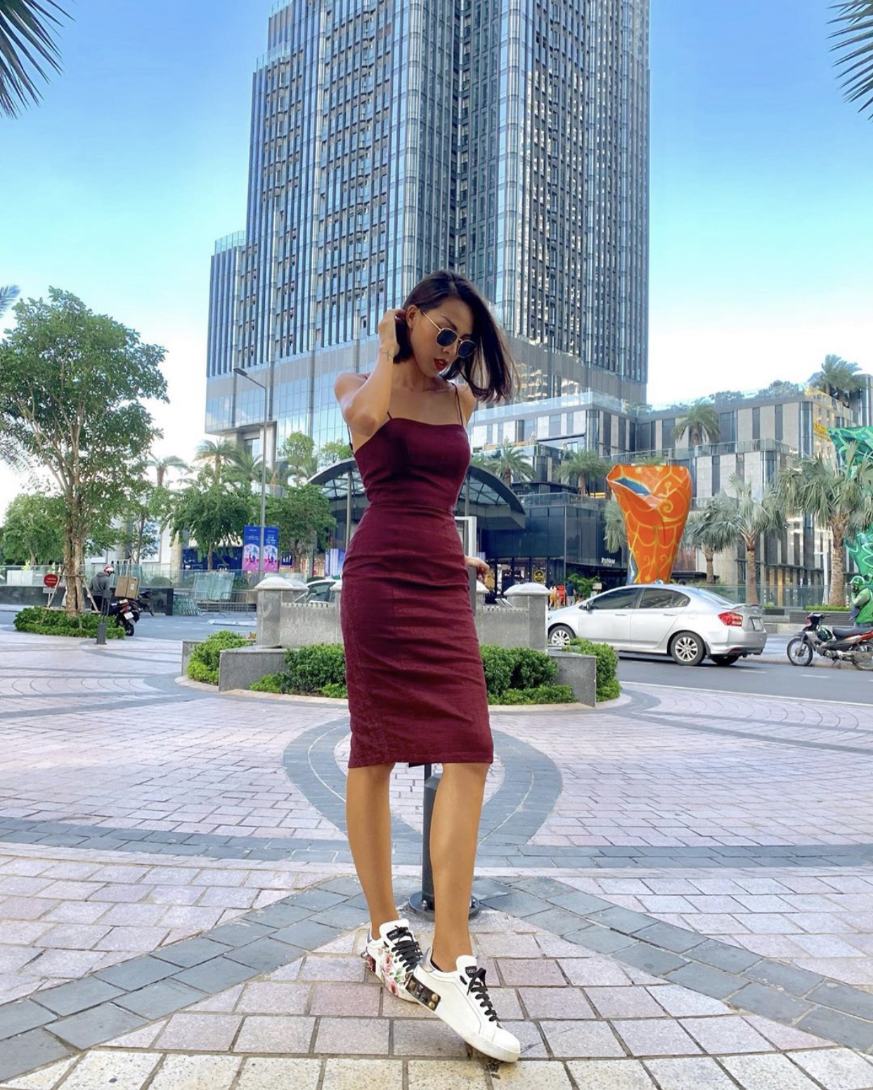 Giống cô bạn thân của mình là Kỳ Duyên, Minh Triệu cũng phối đầm body với sneaker tạo sự khoẻ khắn