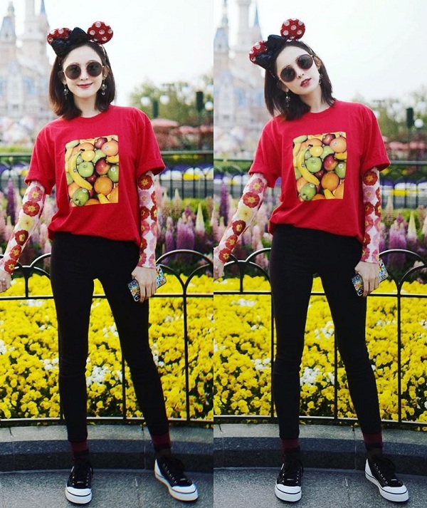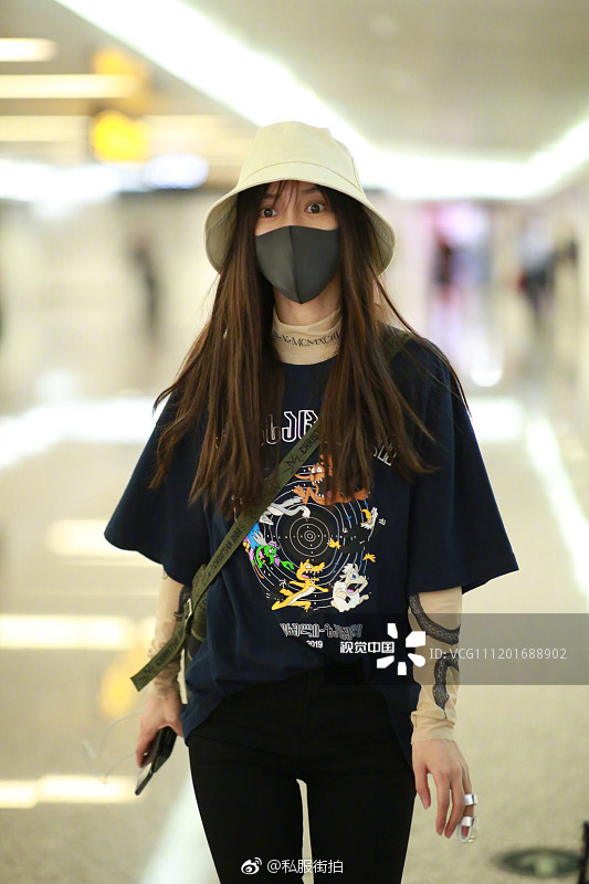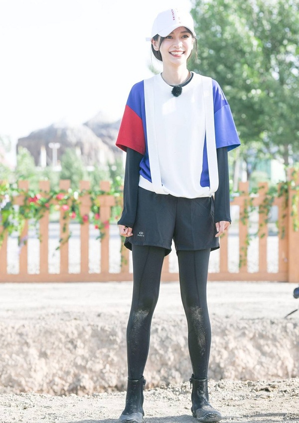 Là một trong những thành viên chính thức của chương trình Running Man phiên bản Trung, vì công việc bắt buộc phải làm việc ngoài trời nên cô cũng bắt chước đàn chị Dương Mịch chọn cho mình style áo so le thế này