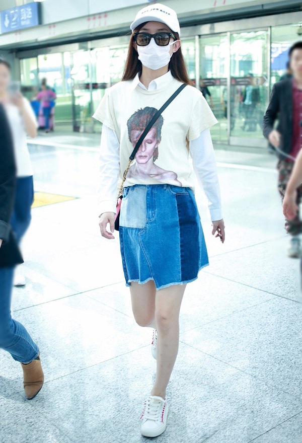 Nàng bánh bèo yểu điệu Triệu Lệ Dĩnh chọn áo sơ mi trắng mặc bên trong mix cùng áo thun bên ngoài mix phối cùng váy jeans và giày thể thao khi ở sân bay