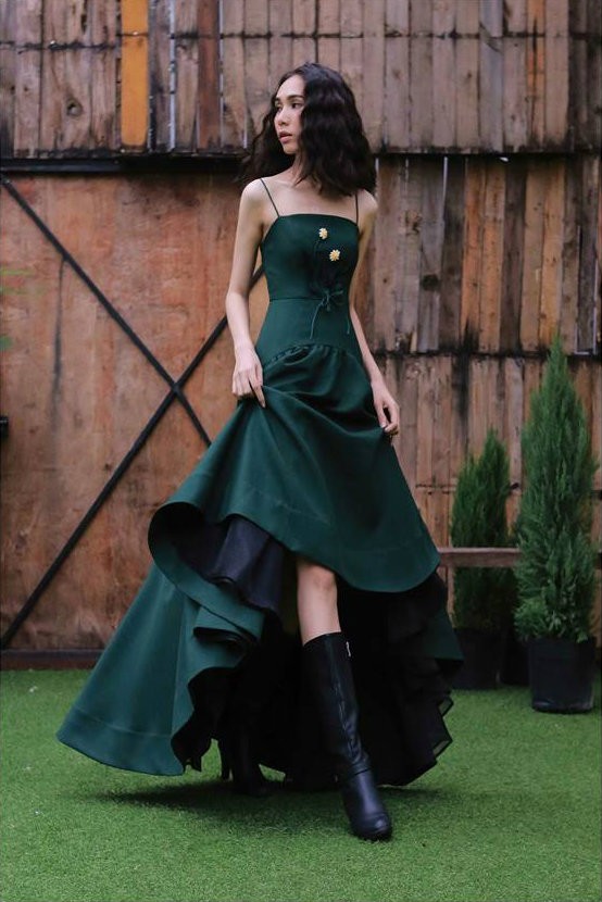Cận cảnh chiếc váy màu xanh rêu của NTK La Renn.