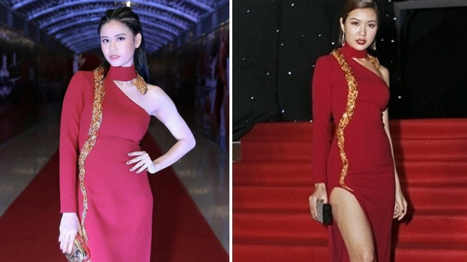 Bà xã Tim cũng có lần “đè bẹp” Á hậu Thúy Vân khi diện cùng chiếc đầm đỏ rực xẻ quá nửa đùi. Chiếc đầm ôm sát giúp Quỳnh Anh phô được vòng một nảy nở hơn hẳn á hậu 3 Hoa hậu Quốc tế 2015.