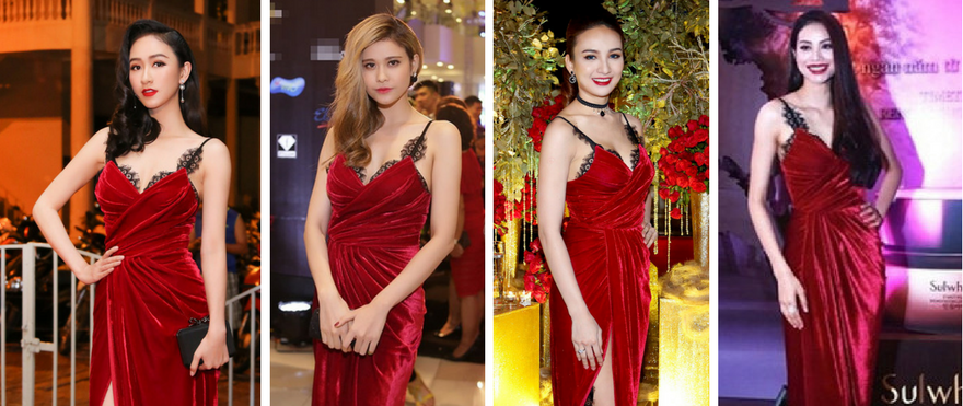 Trong một lần đụng hàng lịch sử khác, Trương Quỳnh Anh mặc cùng thiết kế với cả hoa hậu Hoàn vũ Phạm Hương, hoa hậu Du lịch Ngọc Diễm và á hậu Hà Thu nhưng vẻ đẹp và thần thái của cô vẫn không hề thua kém.