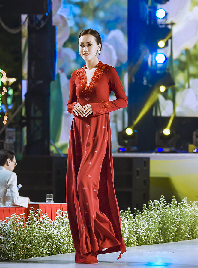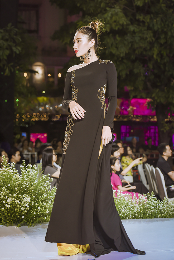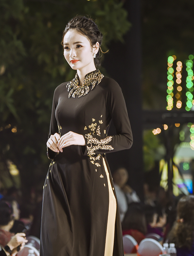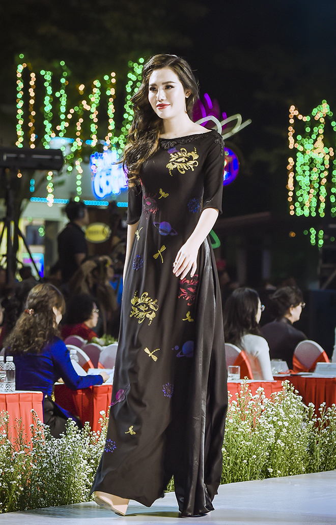 Gam màu đỏ bã trầu, xanh dương, màu chàm và đen chủ đạo của văn hóa mặc người Tày là cảm hứng để NTK tạo nên những tà áo dài bay bổng đậm chất vẻ đẹp dân tộc. Bên cạnh màu sắc đặc trưng, họa tiết hoa văn thêu đính thủ công cũng rất tinh tế và khéo léo.