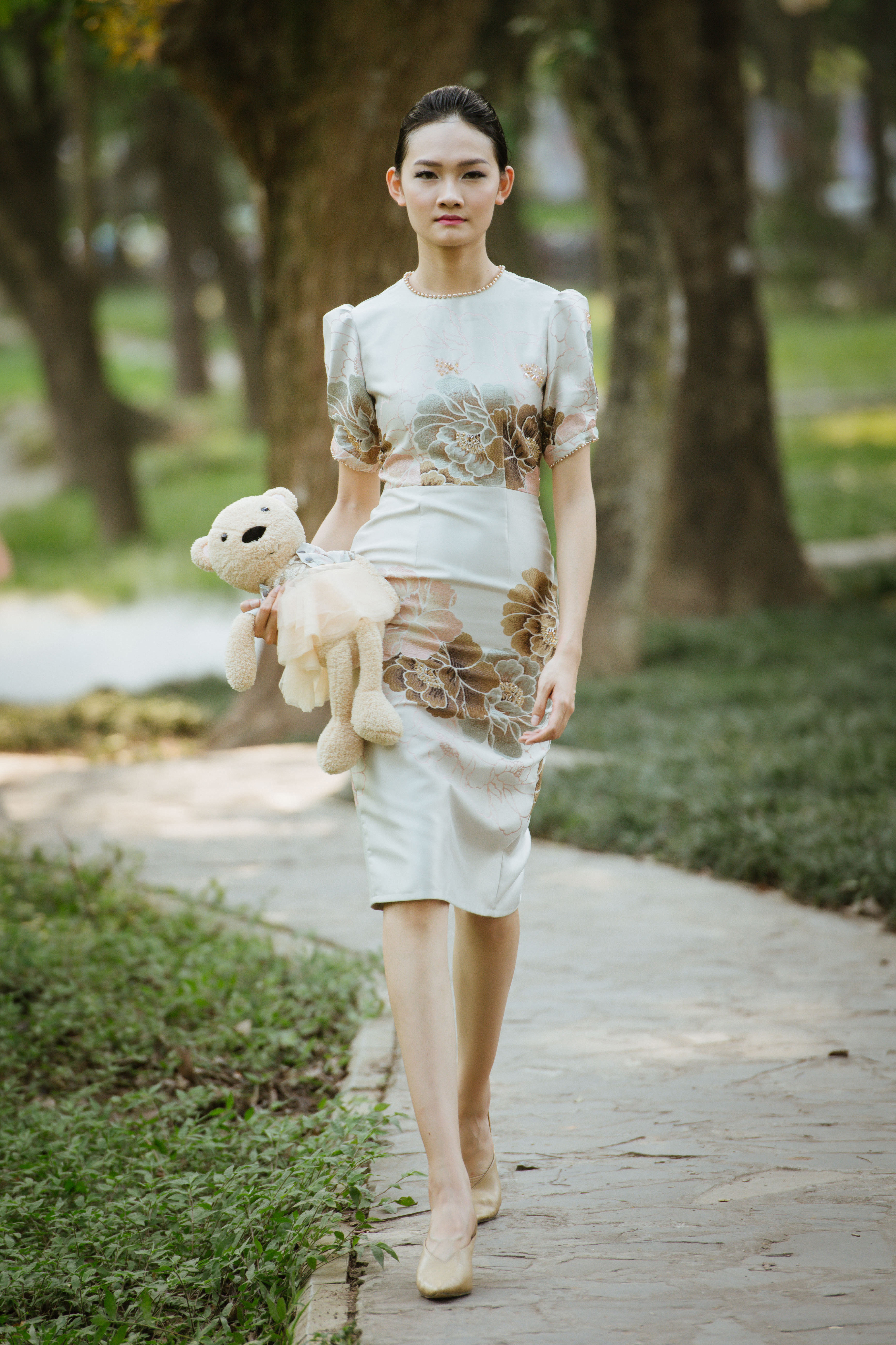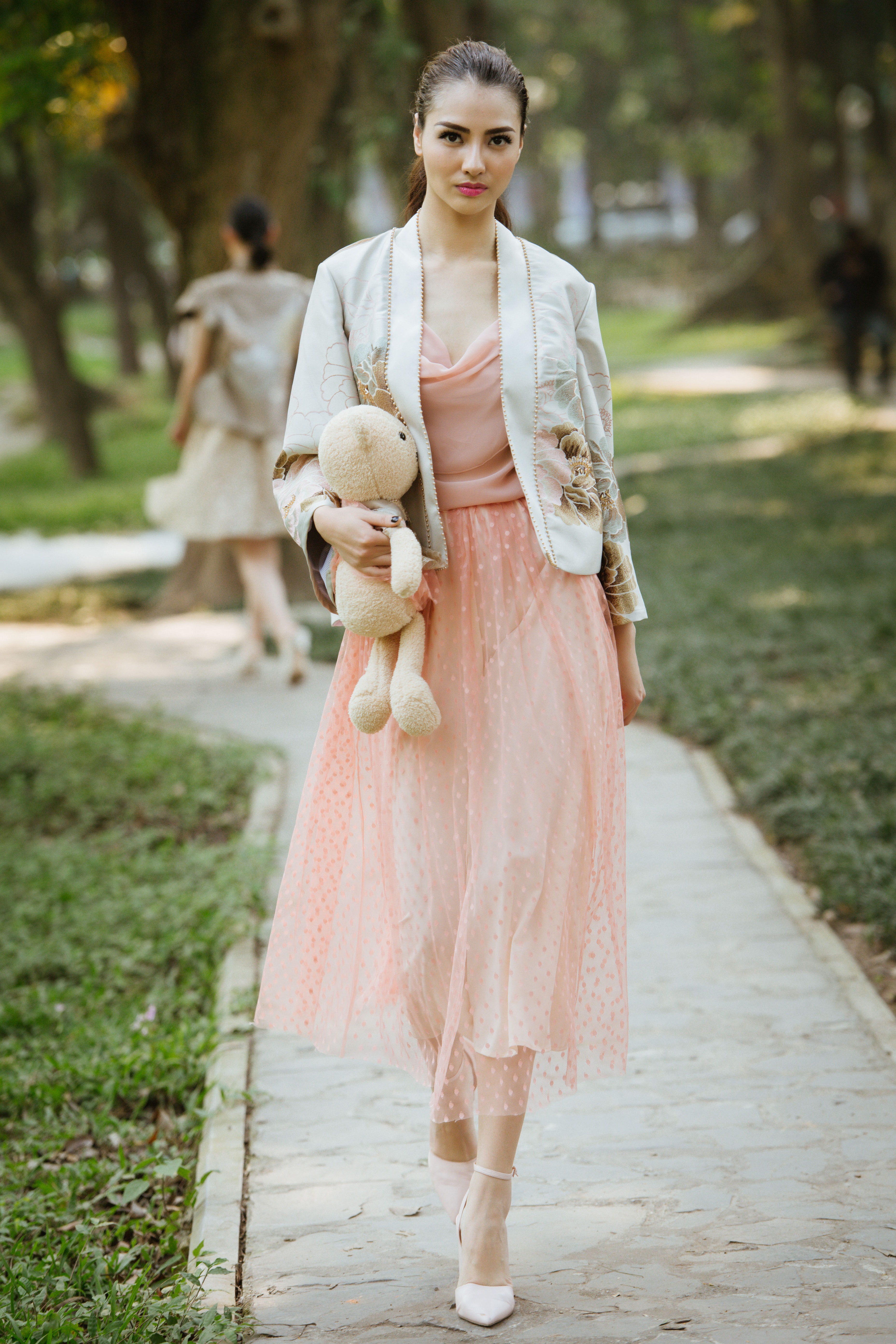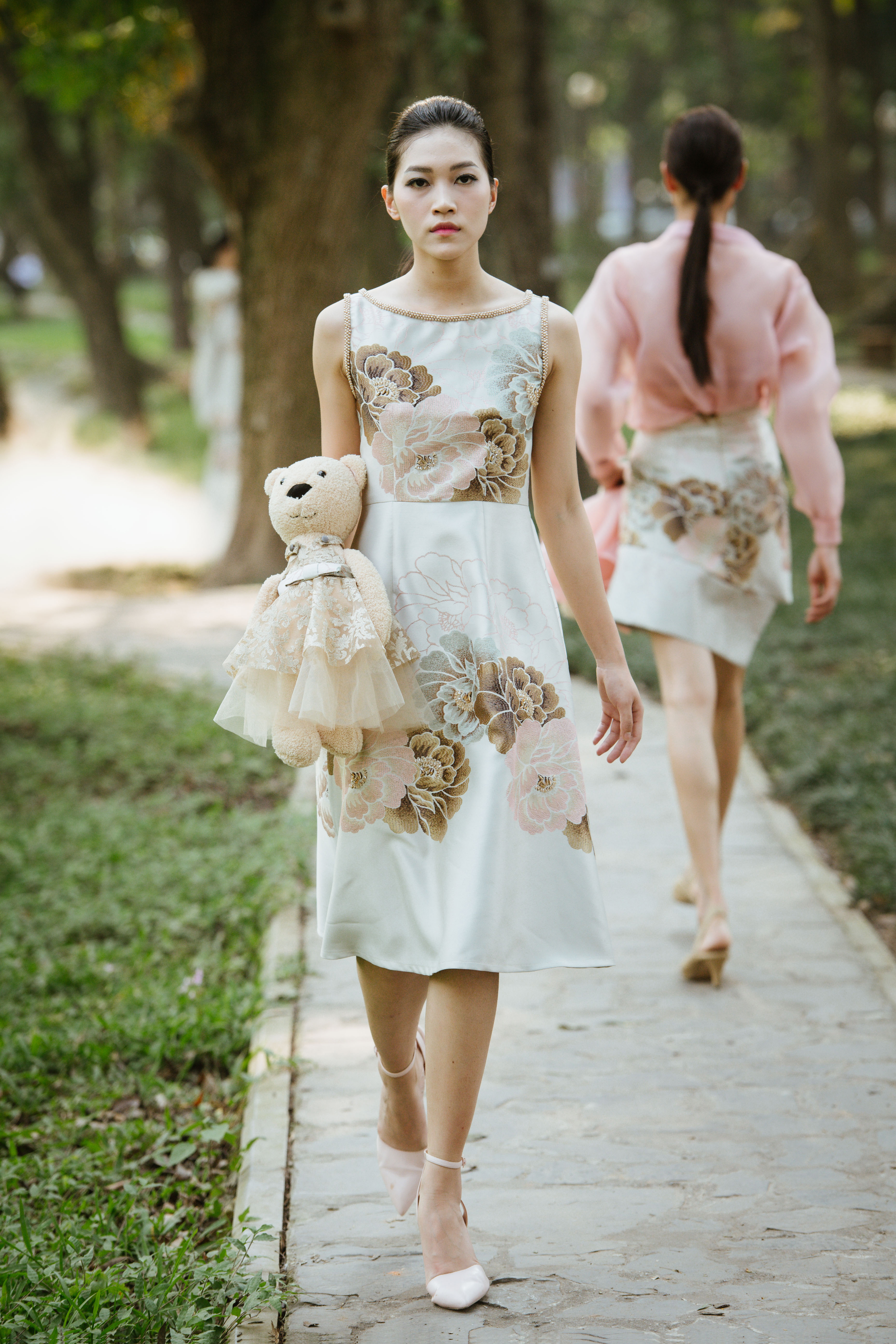 Toàn bộ các thiết kế được thêu đính kết vô cùng tỉ mỉ, mọi thứ từ dựng phom đến đường viền áo đều được làm thủ công cho thấy một sự cầu toàn và chỉn chu của NTK. Các chú gấu xinh xắn được các người mẫu cầm trên tay trình diễn cùng cũng được Cao Minh Tiến thiết kế phiên bản mini của bộ sưu tập hết sức đáng yêu và thú vị.
