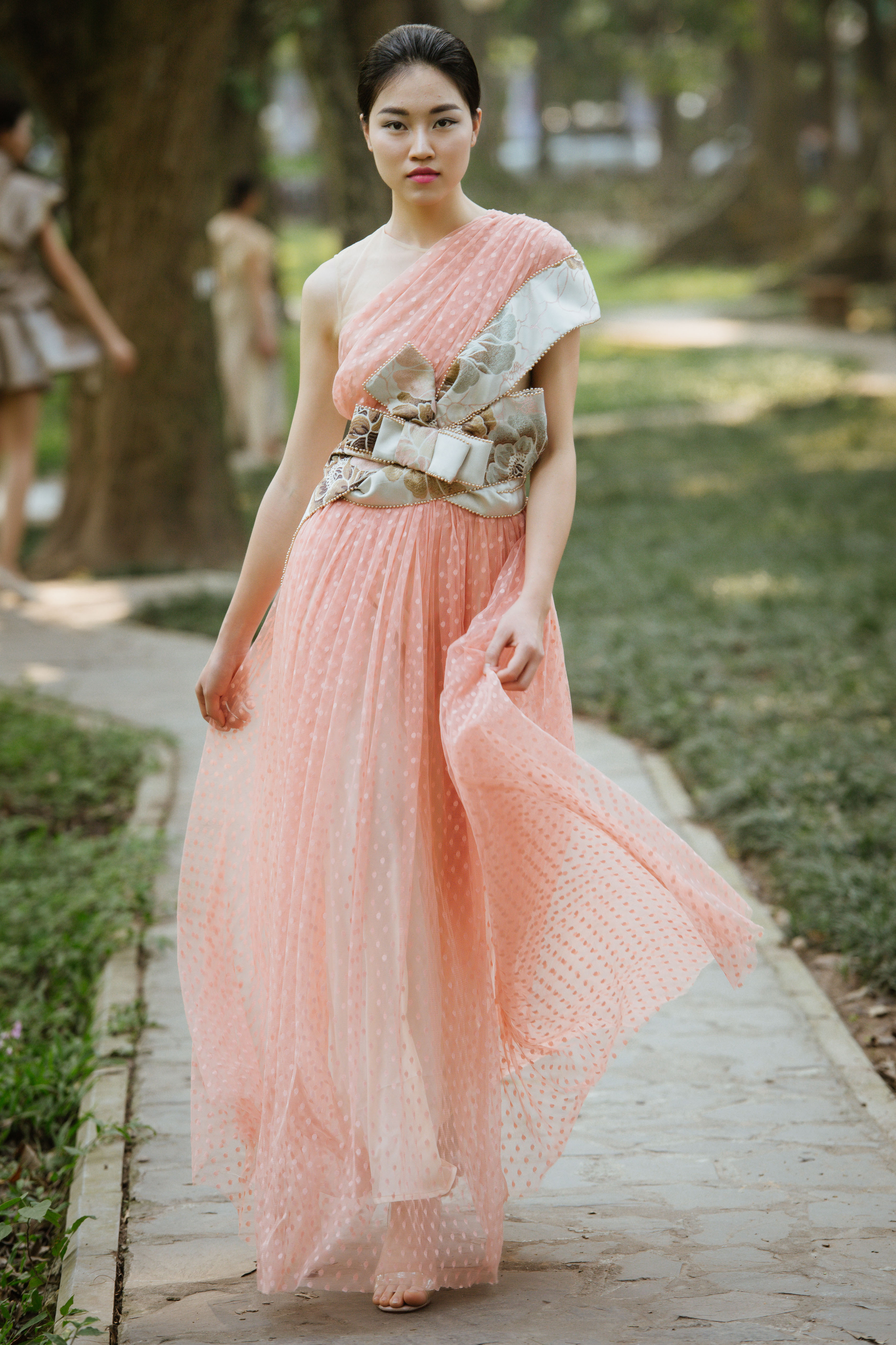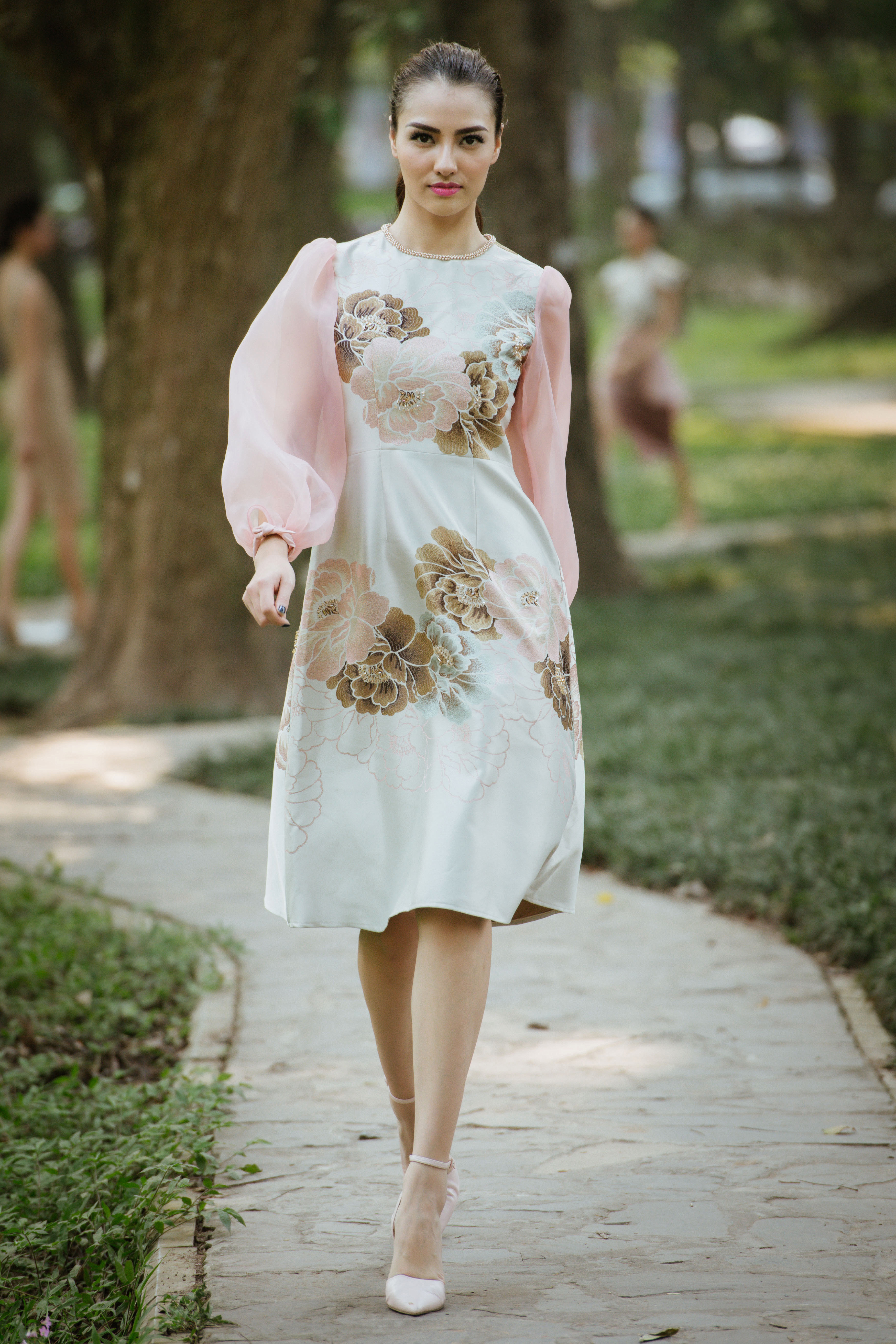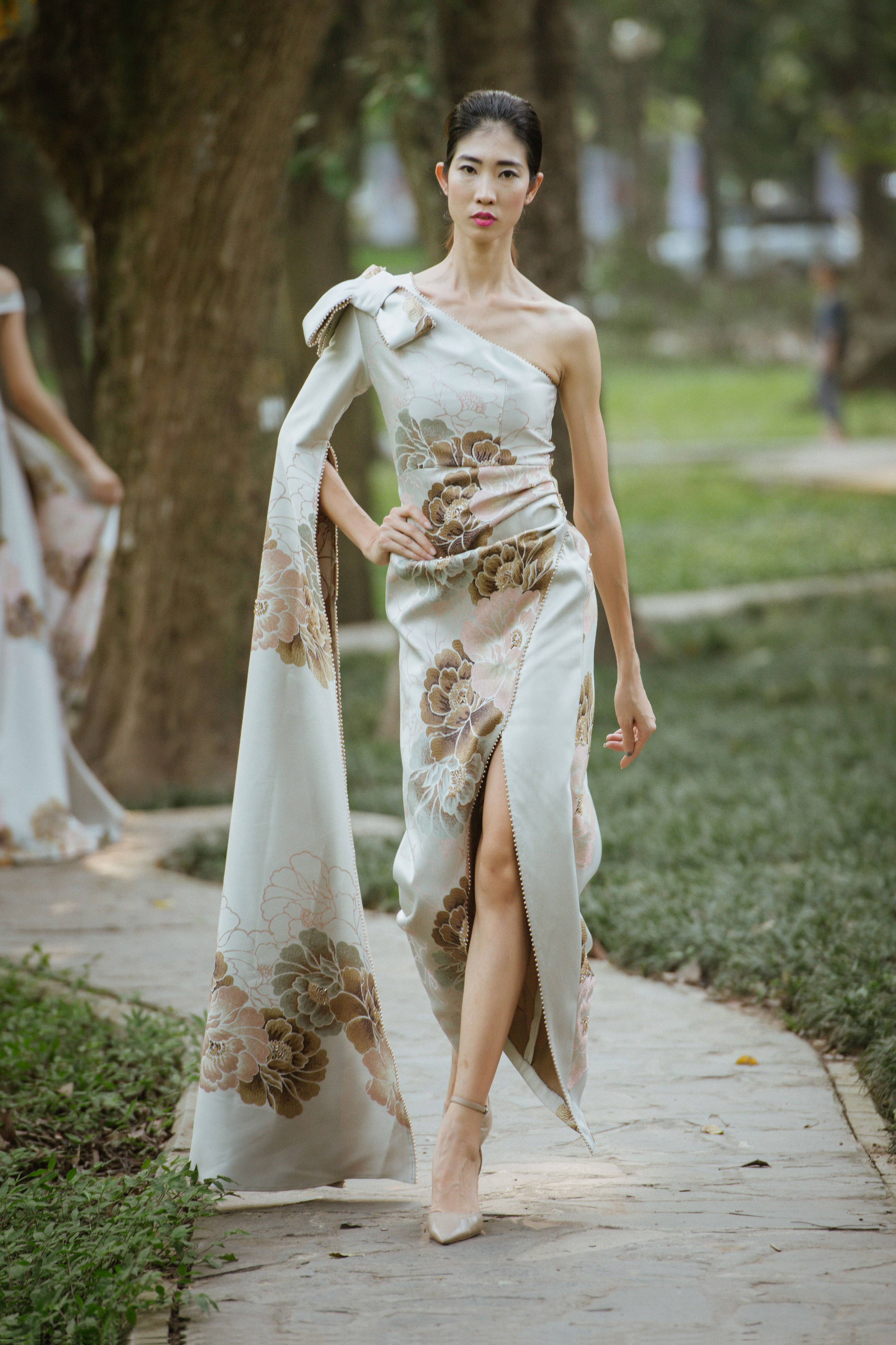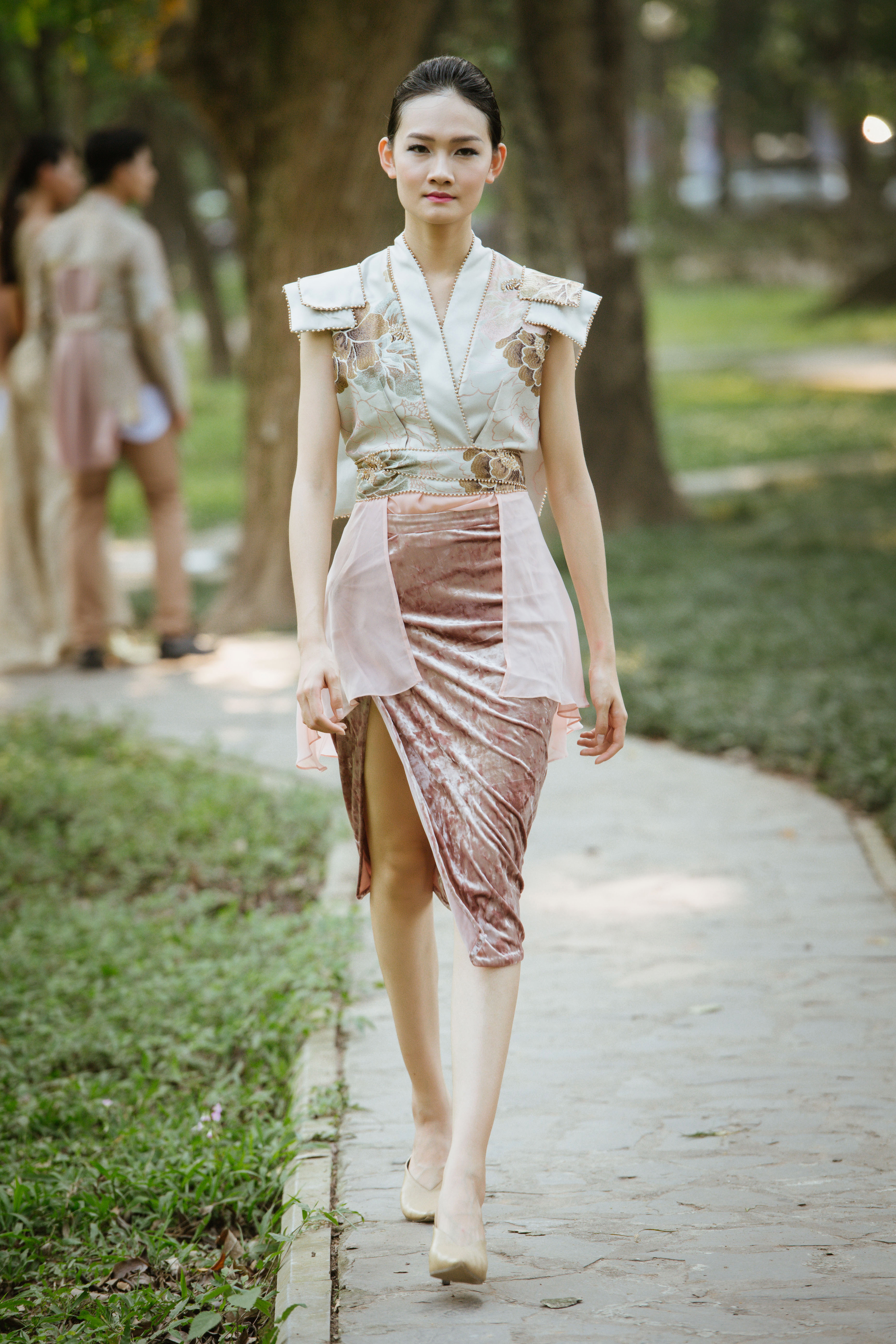 Các thiết kế mang đến một hơi thở mới cho chất liệu gấm, chất liệu được xem là quyền quý của người phương Đông. Kết hợp với hoạ tiết hoa phù dung, người xem chợt có những mối liên hệ rõ nét về những buổi dạ tiệc phù hoa chốn cung đình xưa.