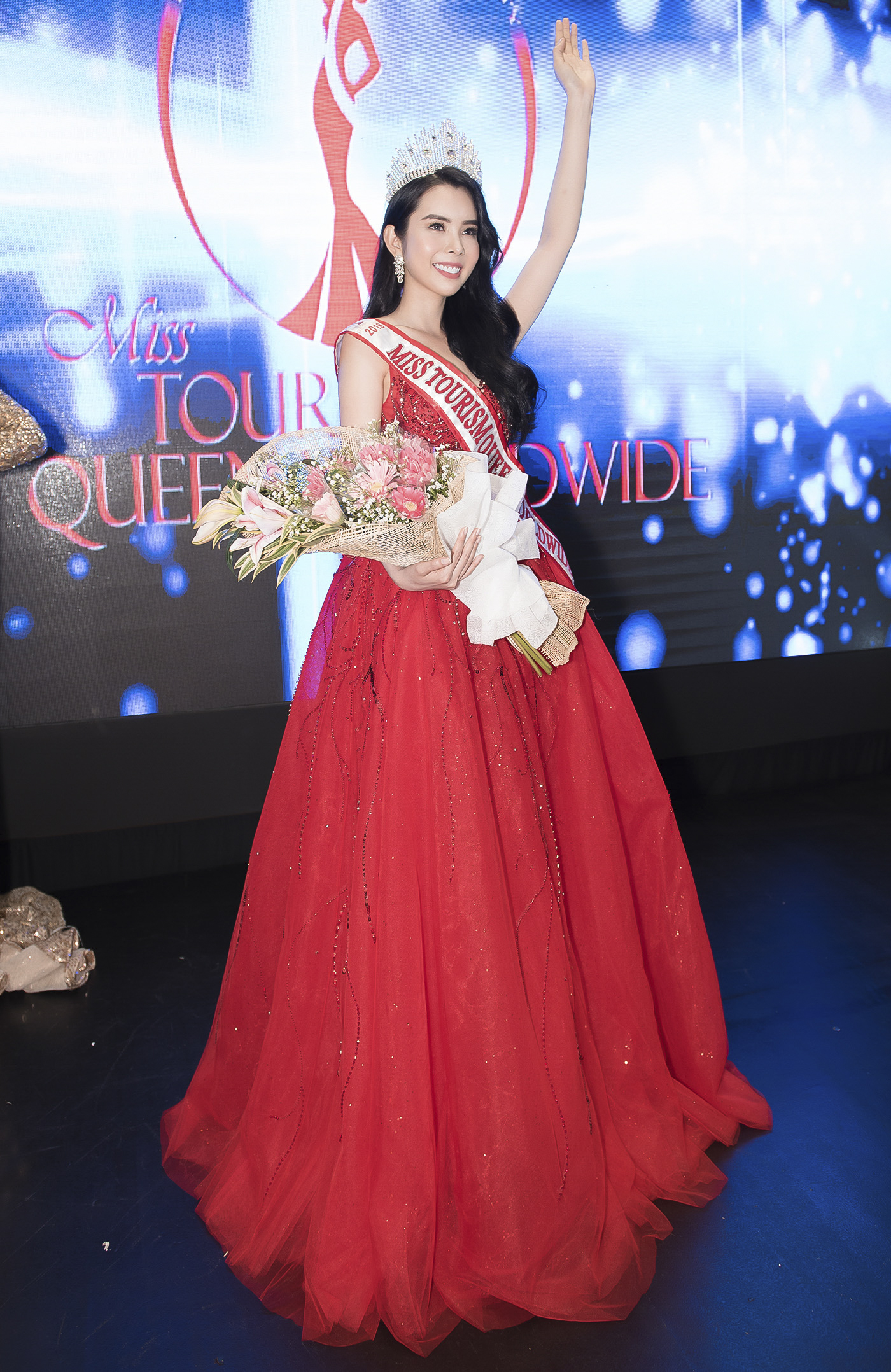 Huỳnh Vy với bộ váy đỏ lộng lẫy kiêu sa lại được xướng tên với danh hiệu cao quý nhất của cuộc thi Miss Tourism Queen Worldwide 2018. Tân Hoa hậu cười rạng rỡ và không giấu sự xúc động khi bước lên nhận vương miện của cuộc thi.