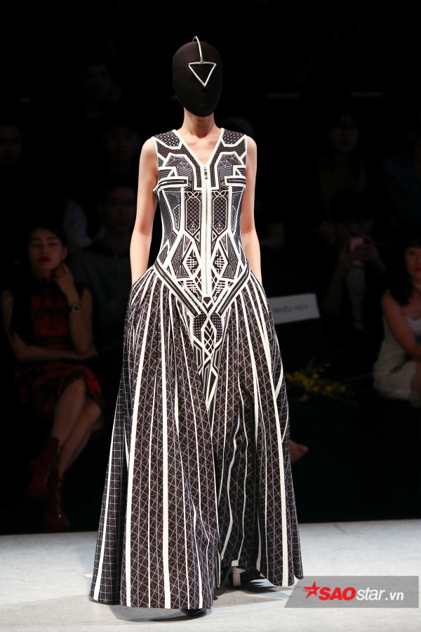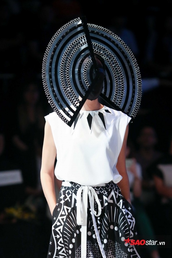 Cách sử dụng phụ kiện vải bịt kín mặt người mẫu vừa giúp các thiết kế thêm phần ấn tượng, nhưng cũng khiến khán giả “thót tim” lo lắng cho từng bước đi của người mẫu.
