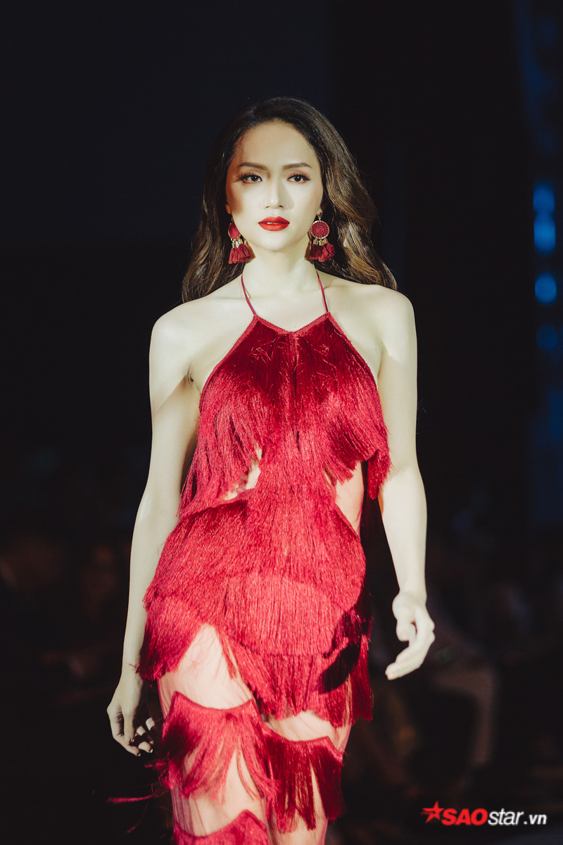 Diện thiết kế váy đỏ đính tua rua, nàng hậu tự tin sải những bước catwalk chắc nhịp trên đôi giày có gót cao tận 25 cm.