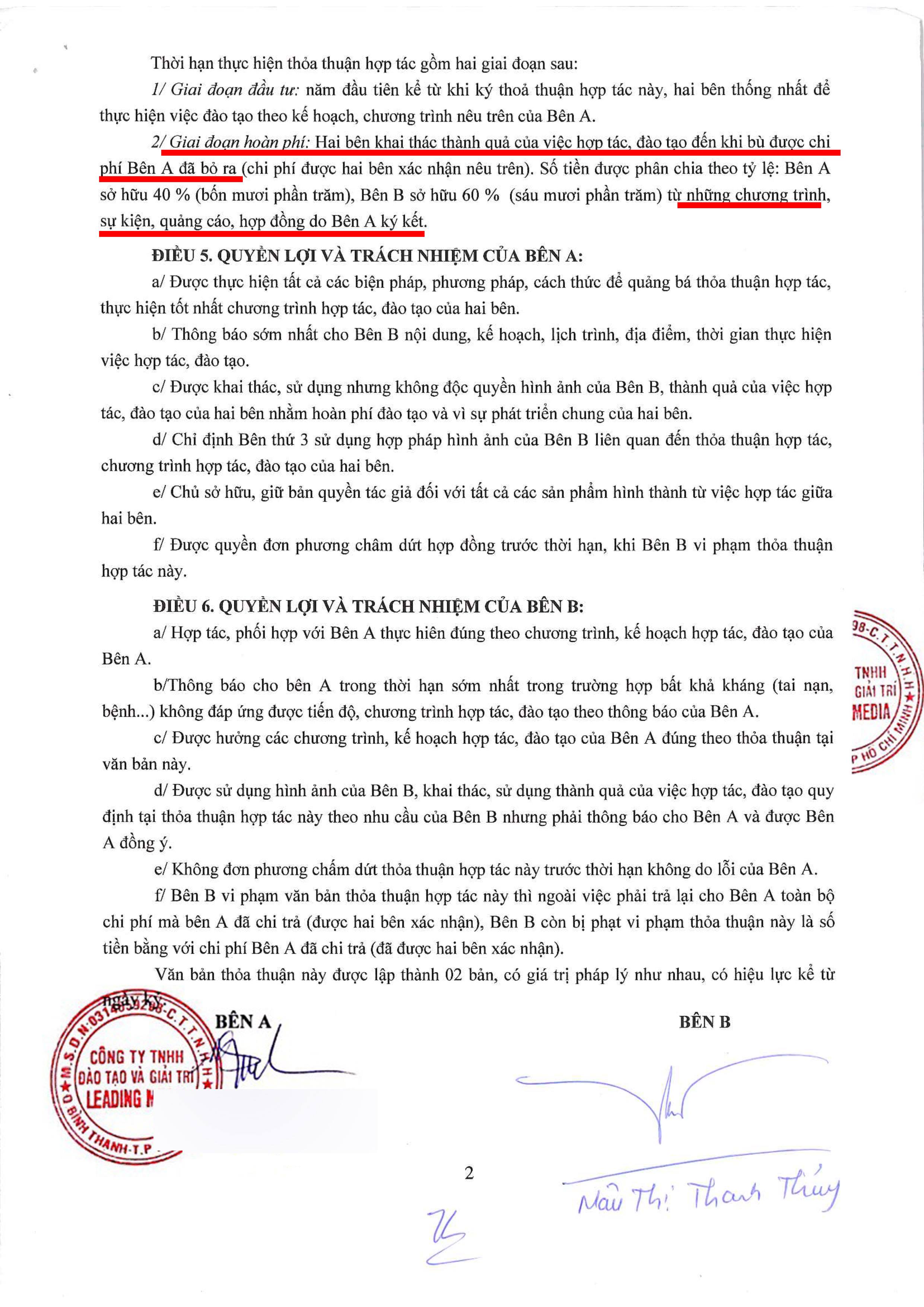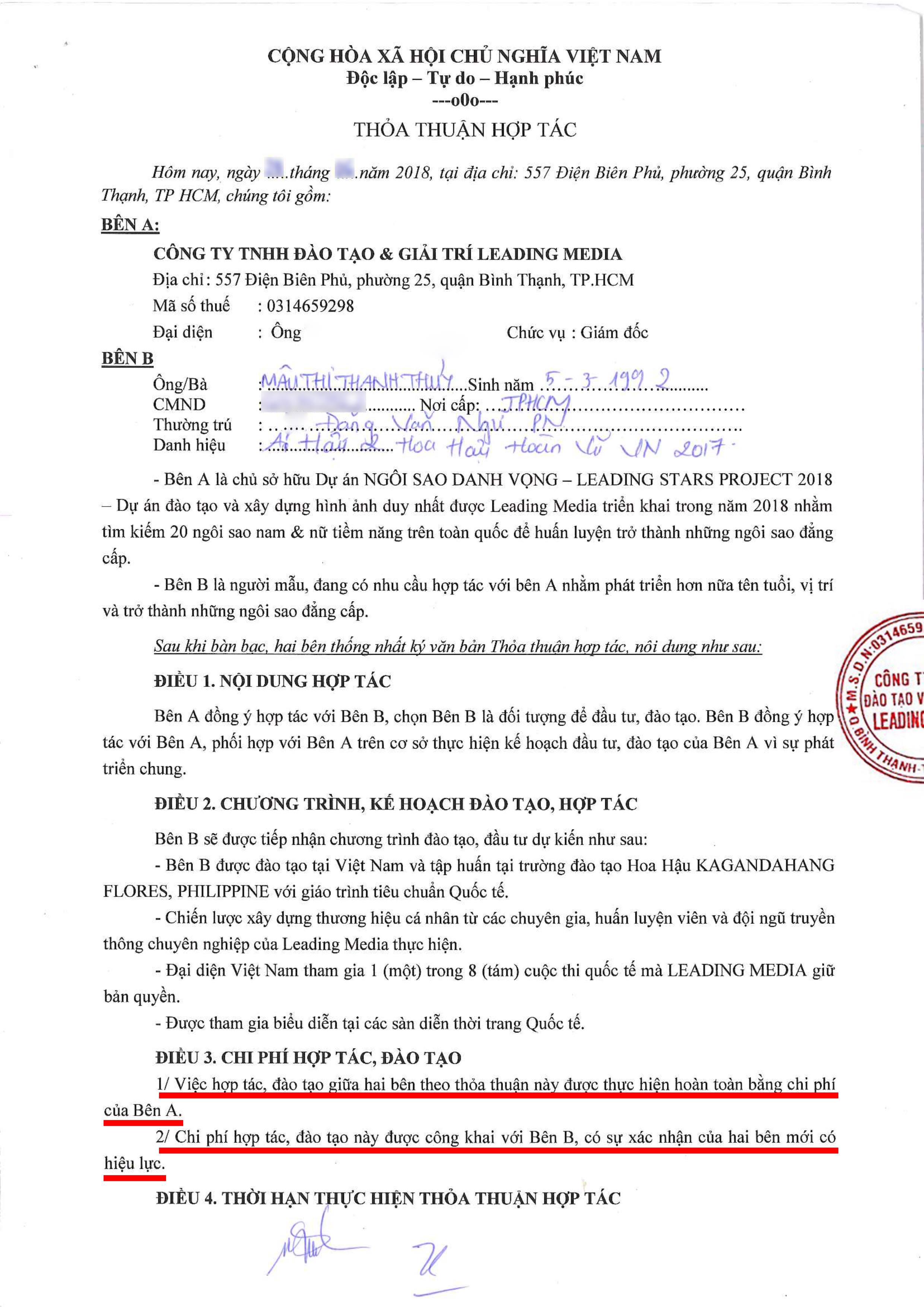 Đây là hợp đồng công khai và đến bây giờ công ty Leading Media vẫn giữ hợp đồng với Mâu Thủy và chưa có biên bản nào kết thúc hợp đồng hay chấm dứt hợp đồng. Và vì mình chưa đi đến biên bản nên chưa có chi phí.
