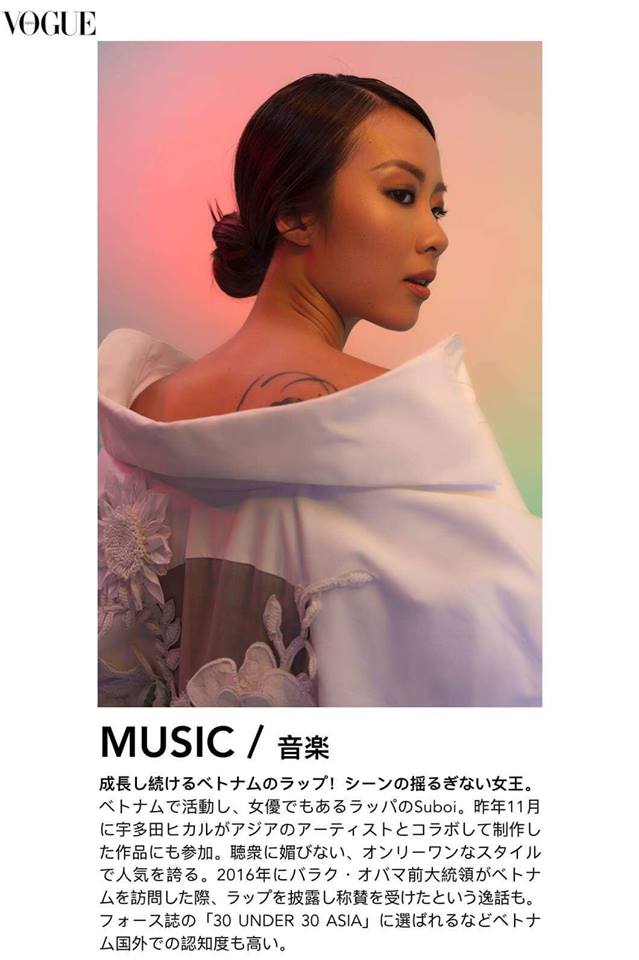 Suboi từng được tạp chí Forbes vinh danh là 30 người trẻ thành công nhất châu Á trong lĩnh vực giải trí nên đó là lí do tại sao cô được vinh dự khi là một trong những ngôi sao Việt đầu tiên xuất hiện trên tạp chí Nhật Vouge đình đám trong chuyên đề “Sự lên ngôi của dàn sao Châu Á” ( Asia Rising) sánh vai cùng các nghệ sĩ Châu Á tài năng khác.