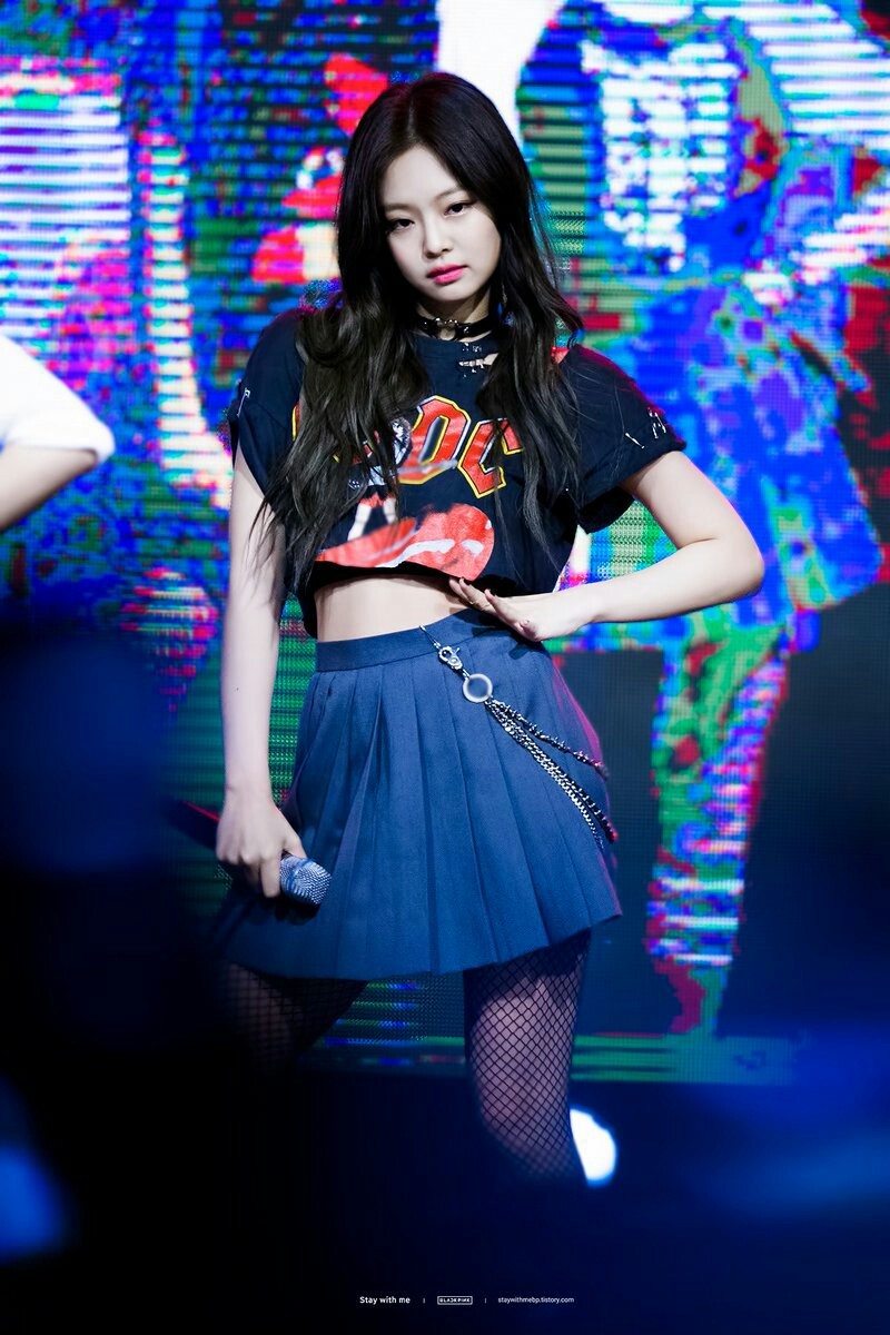 Có thể nói đây là outfit biểu diễn xuất sắc nhất của Jennie trong thời gian quảng bá Du Ddu Du Ddu. Cô mặc áo crop top trắng, quần short trắng, tất lưới trắng và chiếc mũ trắng độc đáo. Ngoại hình đẹp hoàn hảo của nữ idol làm fan boy tới cổ vũ trực tiếp không khỏi đau tim.