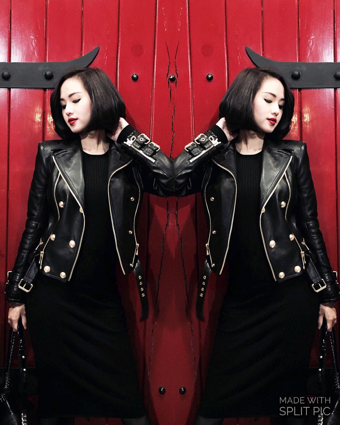 Hai mẹ con tông xuyêt tông đen khi đi dạo phố . Áo khoác đen nổi bật với các họa tiết bươm bướm