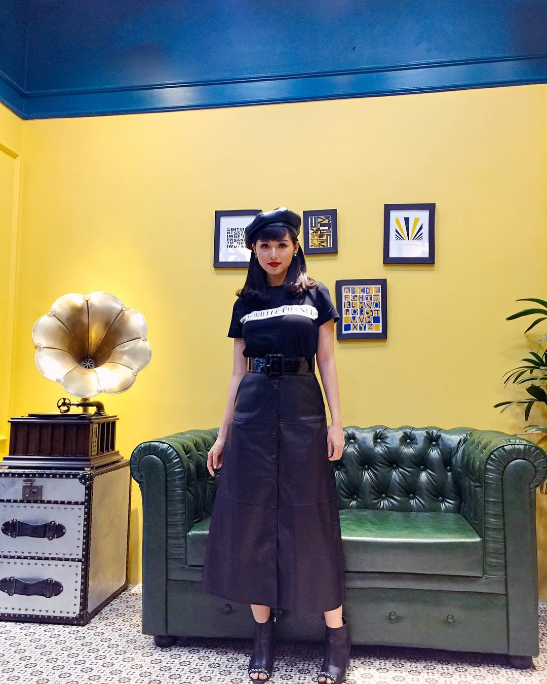Giống như một cô gái Pháp khi Tâm Tít kết hợp áo thun đen với một chiếc váy da thắt belt với điểm nhấn là mũ bê rê nổi bật.