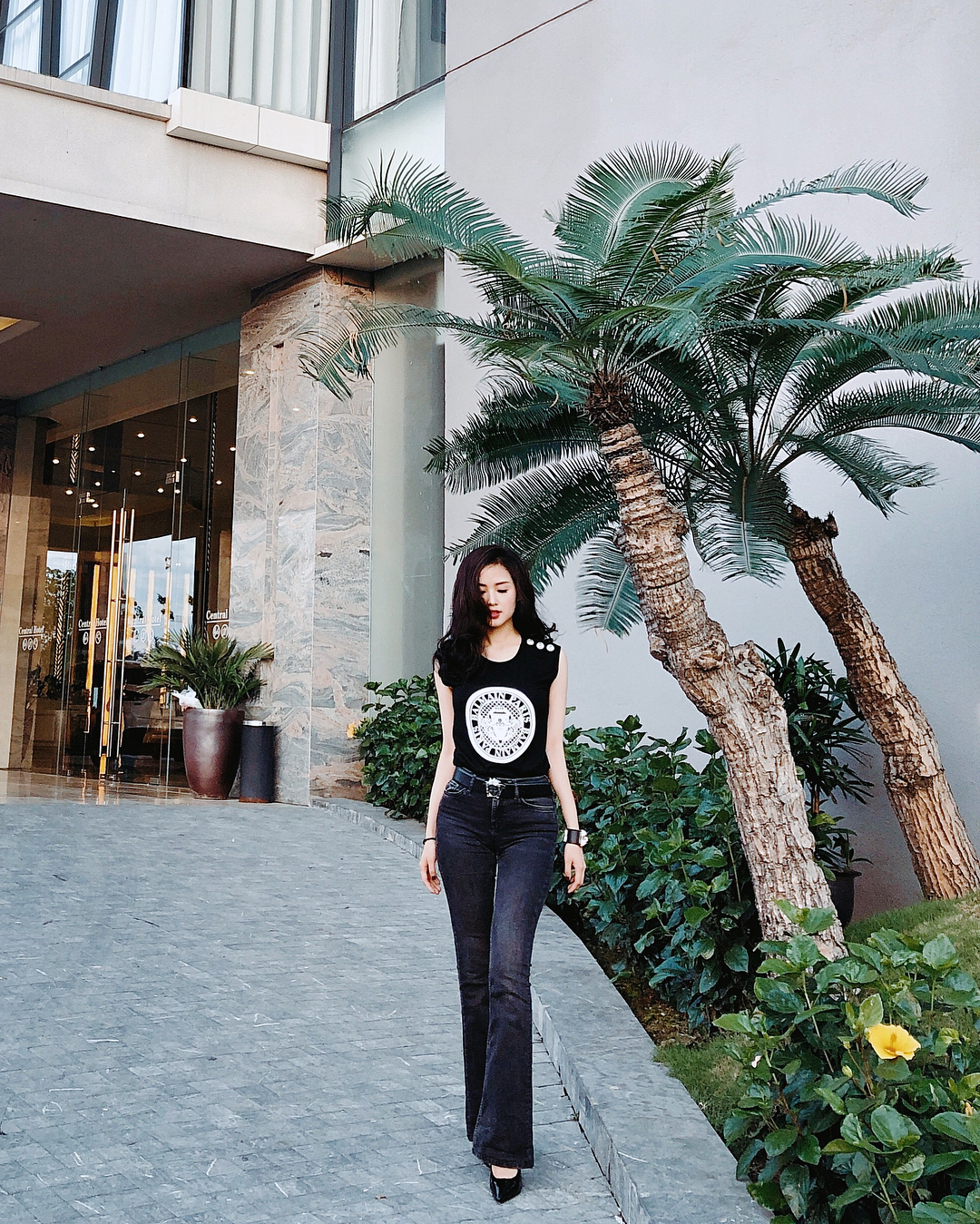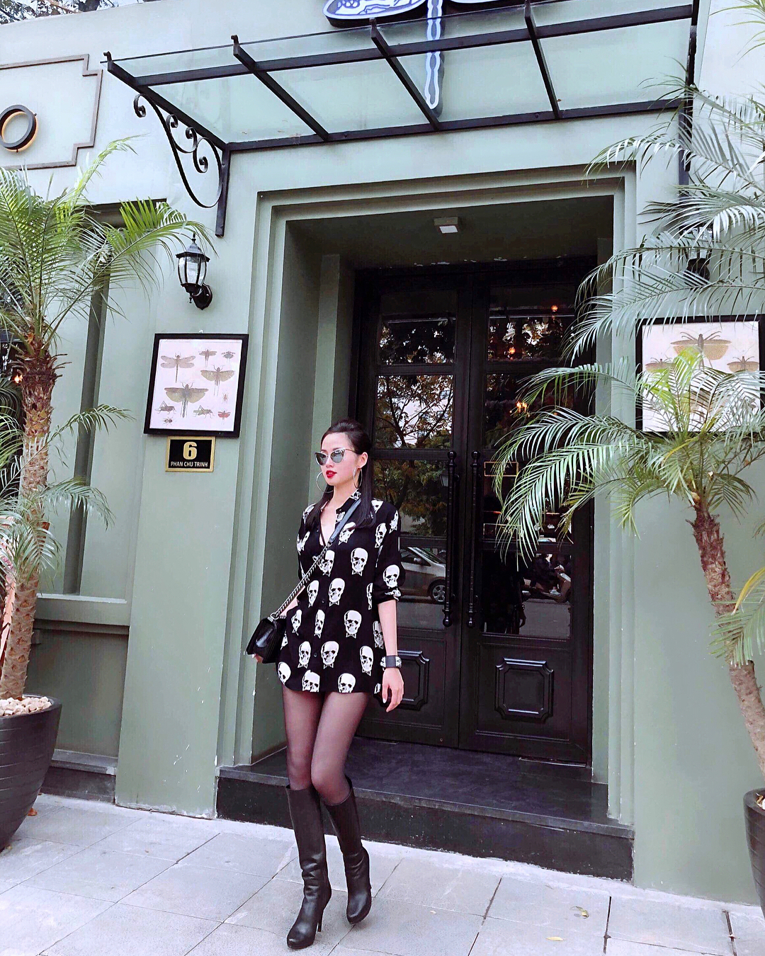 Set đồ của cô luôn đi kèm với những phụ kiện hàng hiệu đắt giá như túi và kính chống nắng Dior, vòng tay Hermes, nổi bật với đôi giày boots cao đen làm tôn vóc dáng.
