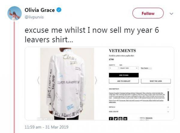 Thậm chí Blogger thời trang Olivia Purvis cũng chia sẻ rằng “Xin lỗi bây giờ tôi cũng bán áo sơ mi kỷ niệm khi tôi rời khỏi trường năm lớp 6 nhé”