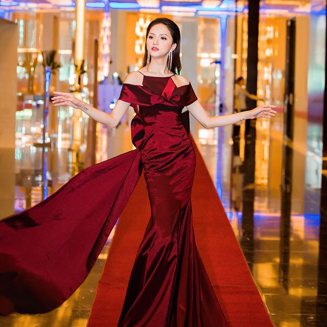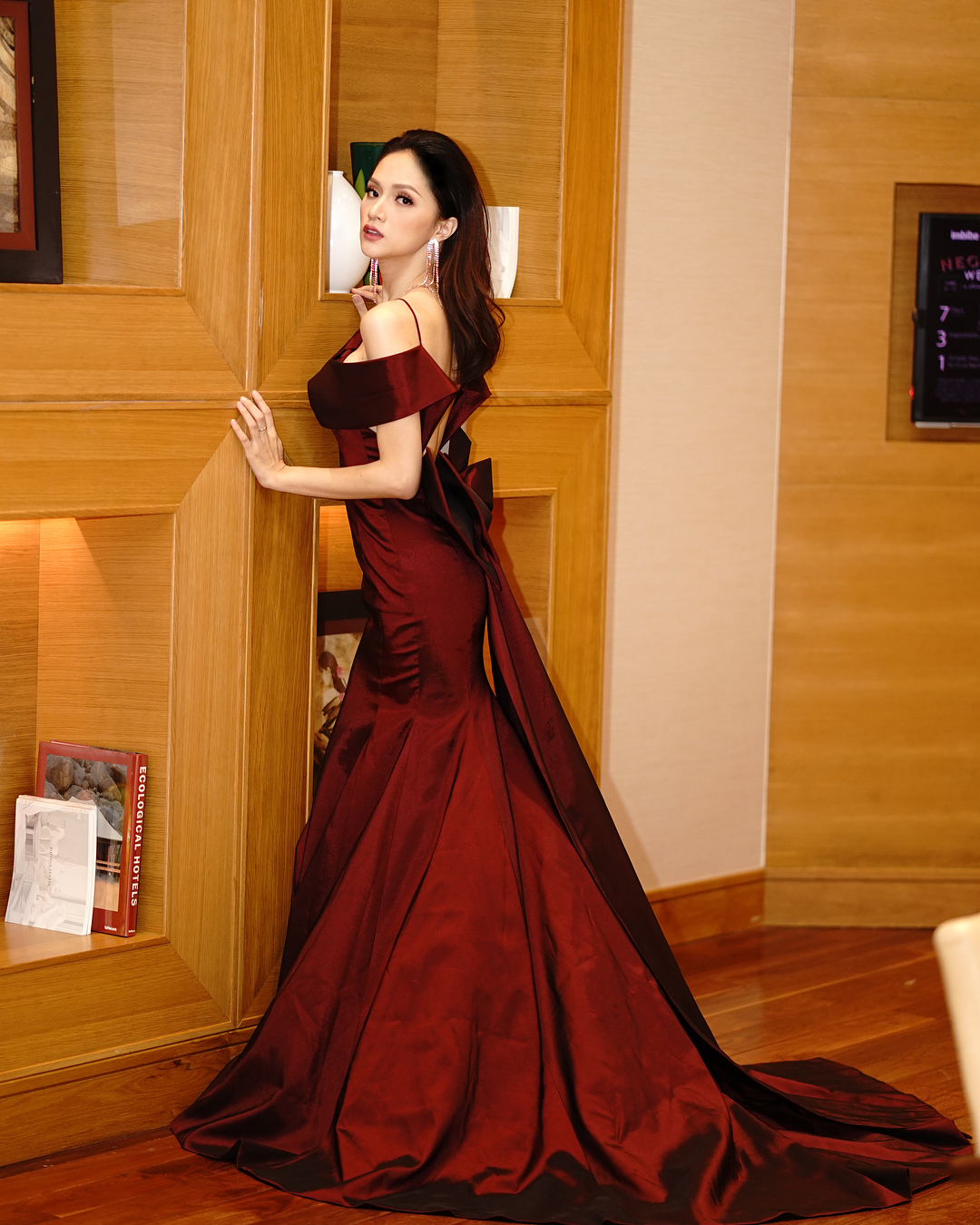 Tông màu vàng đỏ đô cùng những đường cắt sắc nét tôn vinh vóc dáng của nàng Hoa hậu một cách triệt để nhất.