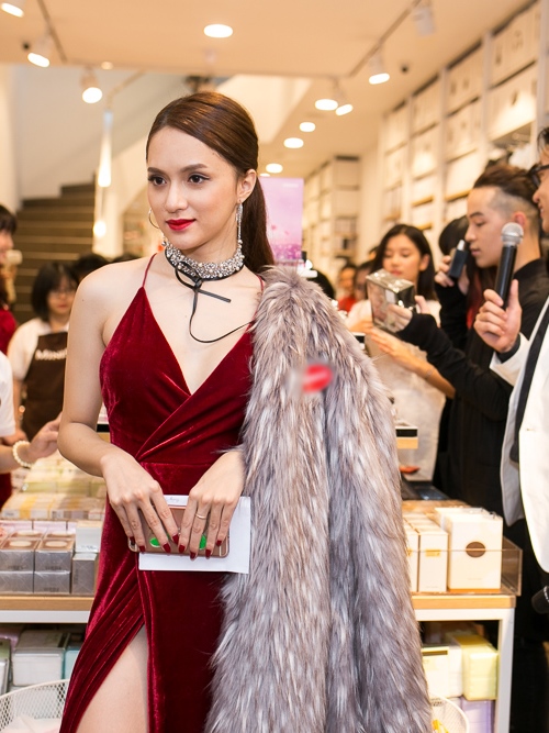 Bộ váy xẻ vừa phải với màu đỏ đun sang trọng rất hợp với áo khoác lông. Kiểu tóc chải thẳng của Giang nhìn cũng rất ưng mắt.