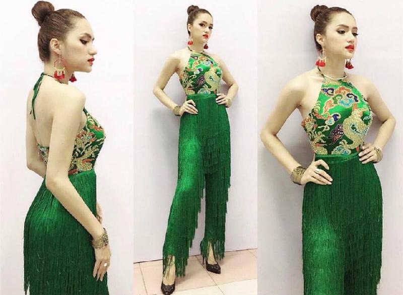 Giang rất chuộng màu xanh lá cây. Cô nàng đã không dưới hai lần xuất hiện trong những bộ đồ có màu sắc này. Chiếc áo dạng yếm khá đẹp nhưng bị chiếc quần tua rua như một chiếc chổi nhiều tầng “phá game” không thương tiếc.