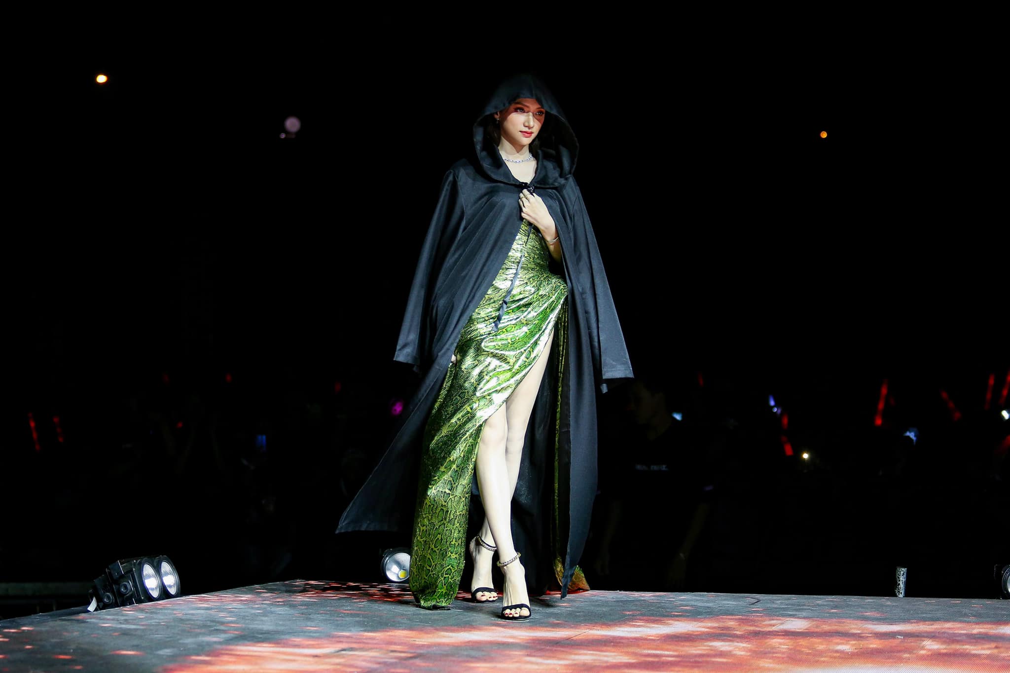 Hương Giang biến hóa đặc sắc hơn cho mẫu đầm khi xuất hiện với chiếc áo choàng đen bí ẩn. Hoa hậu làm tròn số phận của một cô gái xinh đẹp nhưng chịu đau khổ trong tình yêu.