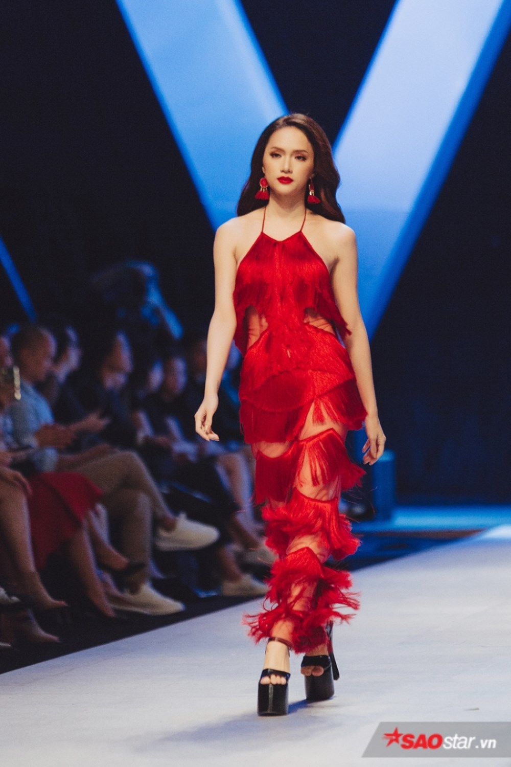 Còn nhớ trong VIFW, Hương Giang từng thể hiện xuất sắc vai trò vedette khi catwalk cùng đôi giày cao gót “lêu nghêu”.