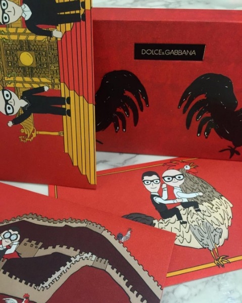Chiếc hộp đỏ D&G có lẽ gây choáng khi in hình gà trống của một mafia người Ý. Còn trên mặt bao lì xì là bức tranh hai nhà thiết kế sáng lập của hãng là Domenico Dolce và Stefano Gabbana, đang cưỡi trên chú gà trống, trông vô cùng ngộ nghĩnh và đáng yêu.