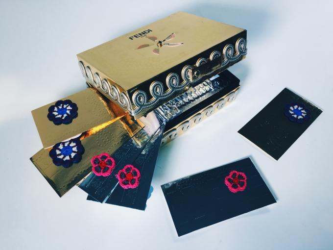 Tạm biệt màu đỏ truyền thống, Fendi sản xuất những mẫu phong bì màu vàng ánh kim và màu xanh lam, in những bông hoa đan bằng len.