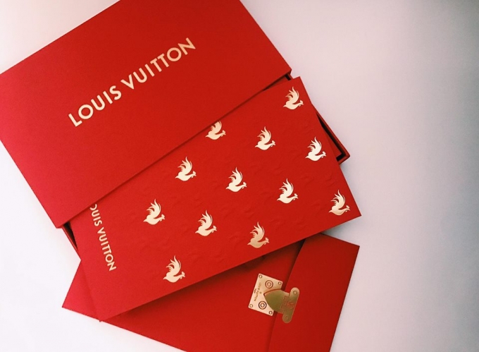Phong bao lì xì của thương hiệu đình đám nước Pháp in hình nổi là những chú gà trống màu vàng ánh kim. Mặt sau của bao lì xì được chạm trở khéo léo hình khuy túi huyền thoại của Louis Vuitton.