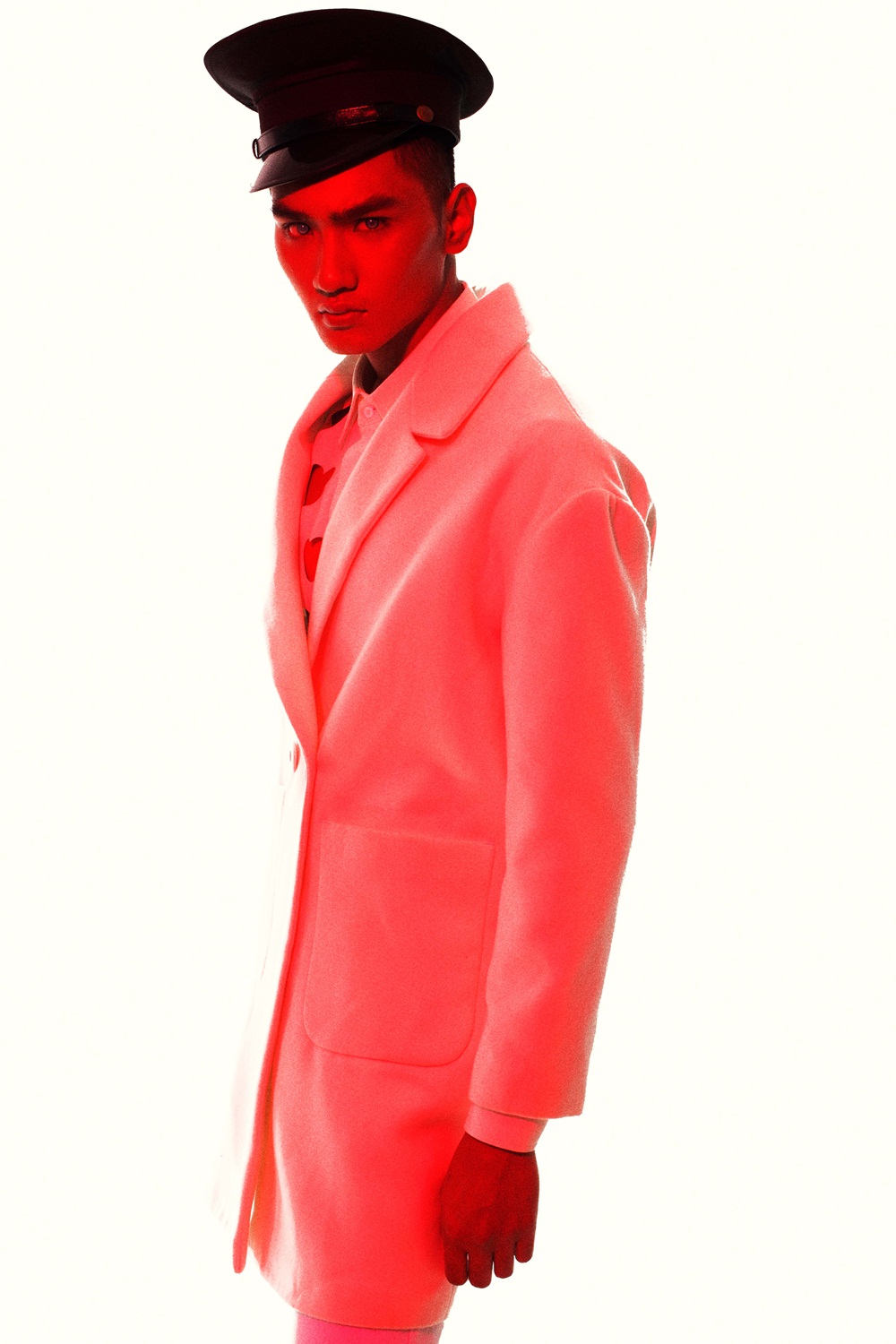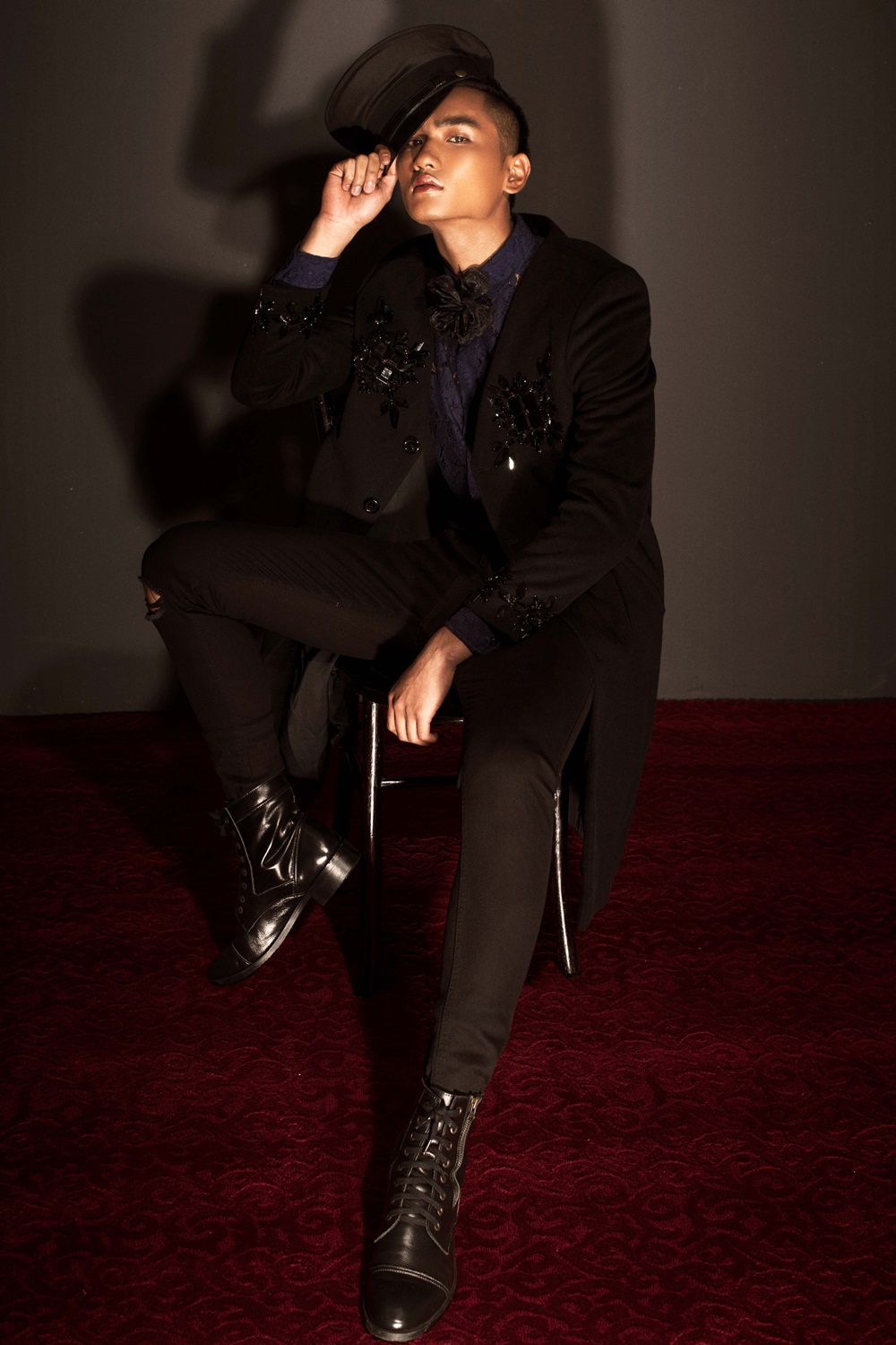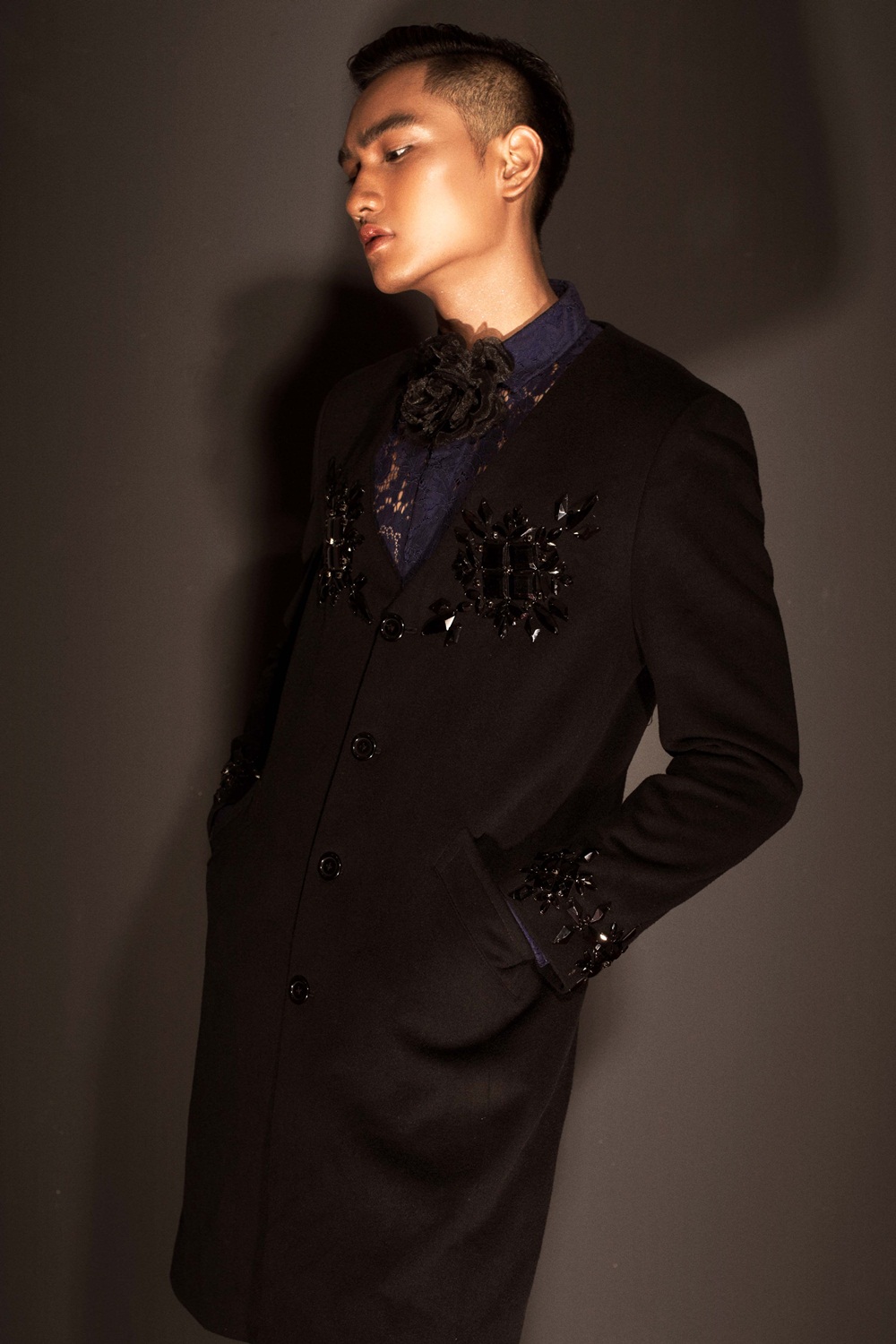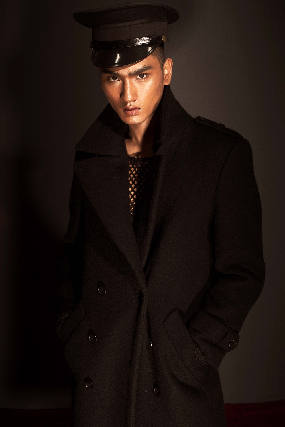 Hình ảnh chàng thủy thủ được Huy Quang khắc họa lạ mắt, mang âm hưởng mới mẻ với măng tô bên ngoài kết hợp áo lưới bên trong. Vẻ ngoài của Huy Quang cuốn hút ánh nhìn của người đối diện không chỉ bởi những đường nét góc cạnh đặc trưng của một người mẫu thời trang cao cấp mà còn thông qua sự thanh tao, cuốn hút của các nhân vật điện ảnh.